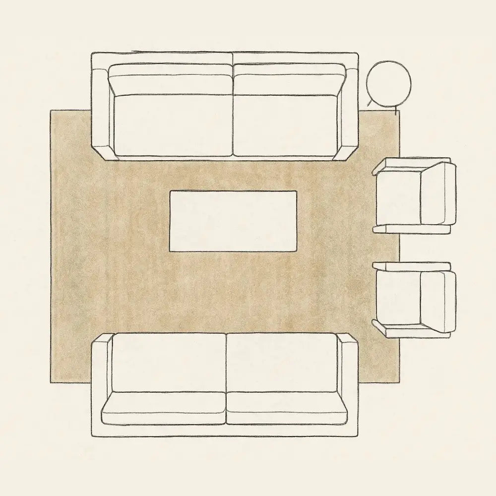 Odanın kalbi, dekorasyonun yıldızı. Bu büyük boy halılar geniş alanları tamamlamakla kalmaz, mekânın kimliğini oluşturur.