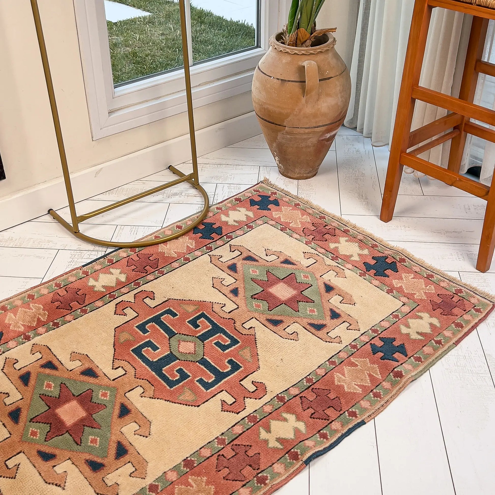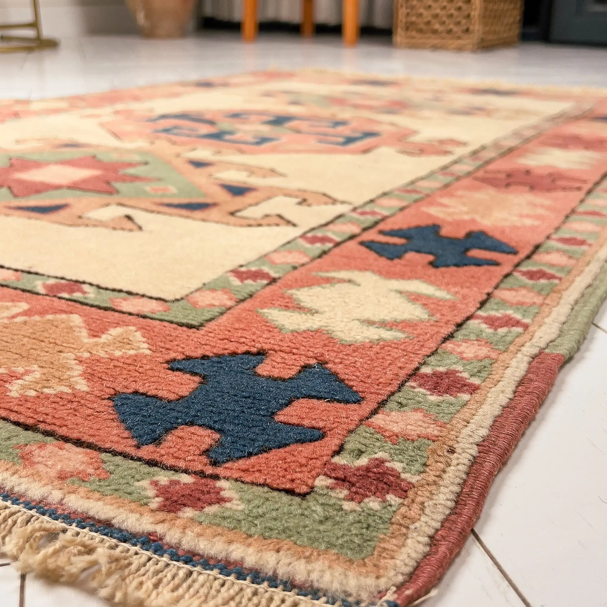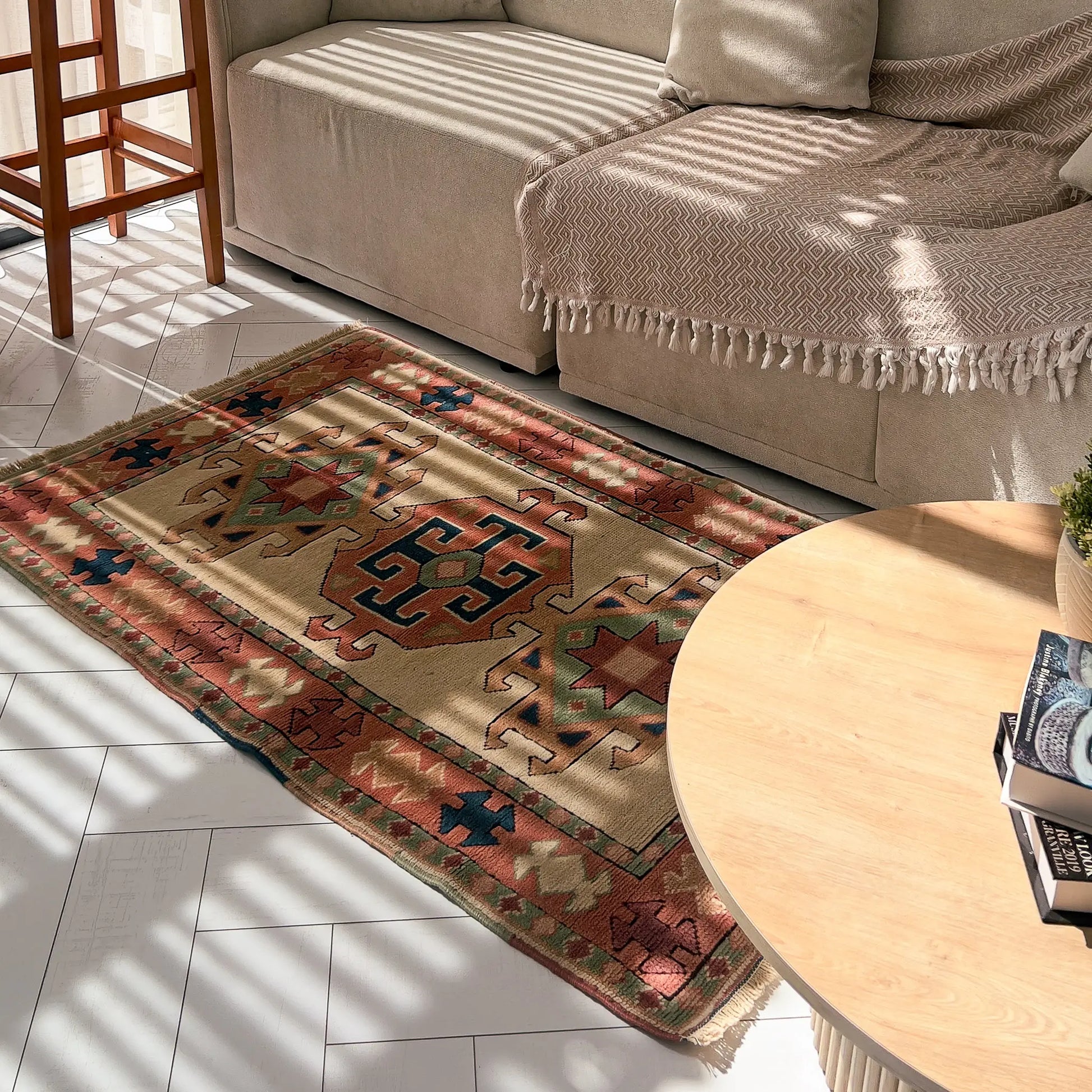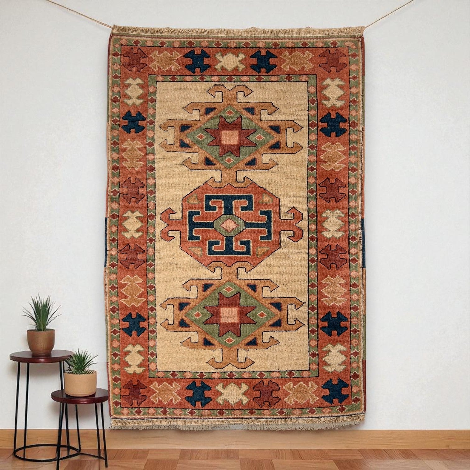Doğu’nun sembolik geometrisini taşıyan bu Kars halısı, krem saha üzerinde kancalı büyük medalyonlar ve terrakotta–zeytin–lacivert dengesiyle rustik, toprakla uyumlu bir ifade sunar. Sık Gördes düğümü ve yün havı sayesinde tok ve dayanıklıdır; ~1990’lar üretimi vintage halı karakteri taşır.