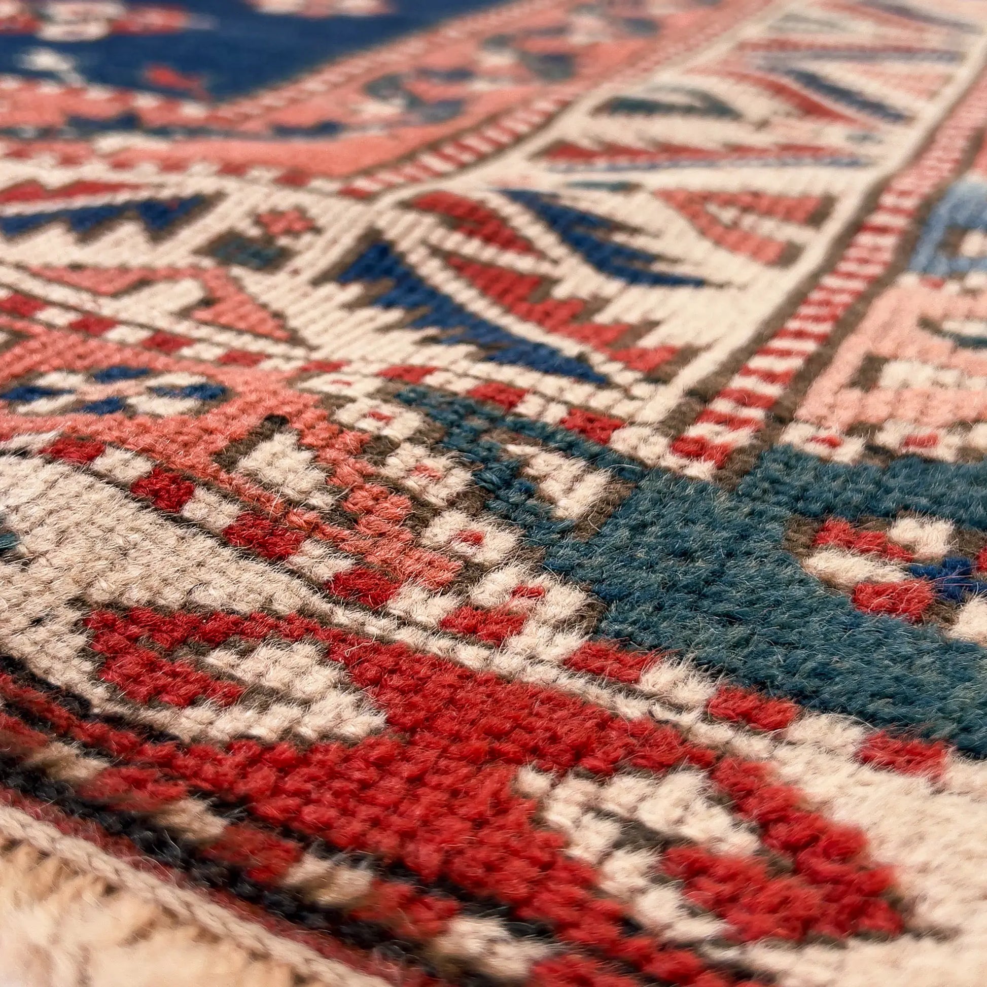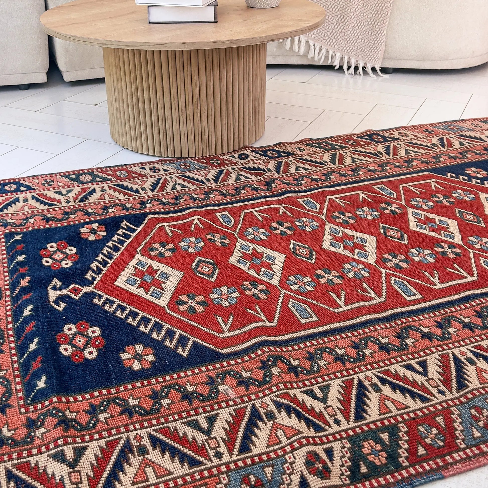 Kırmızı zemin, Yörük ruhunun cesaretini ve ateşini; lacivert ise derinliğini ve güveni simgeliyor. Toprak ve krem tonlarıyla birleşince bu halı, hem cesur hem de huzurlu bir atmosfer yaratıyor.