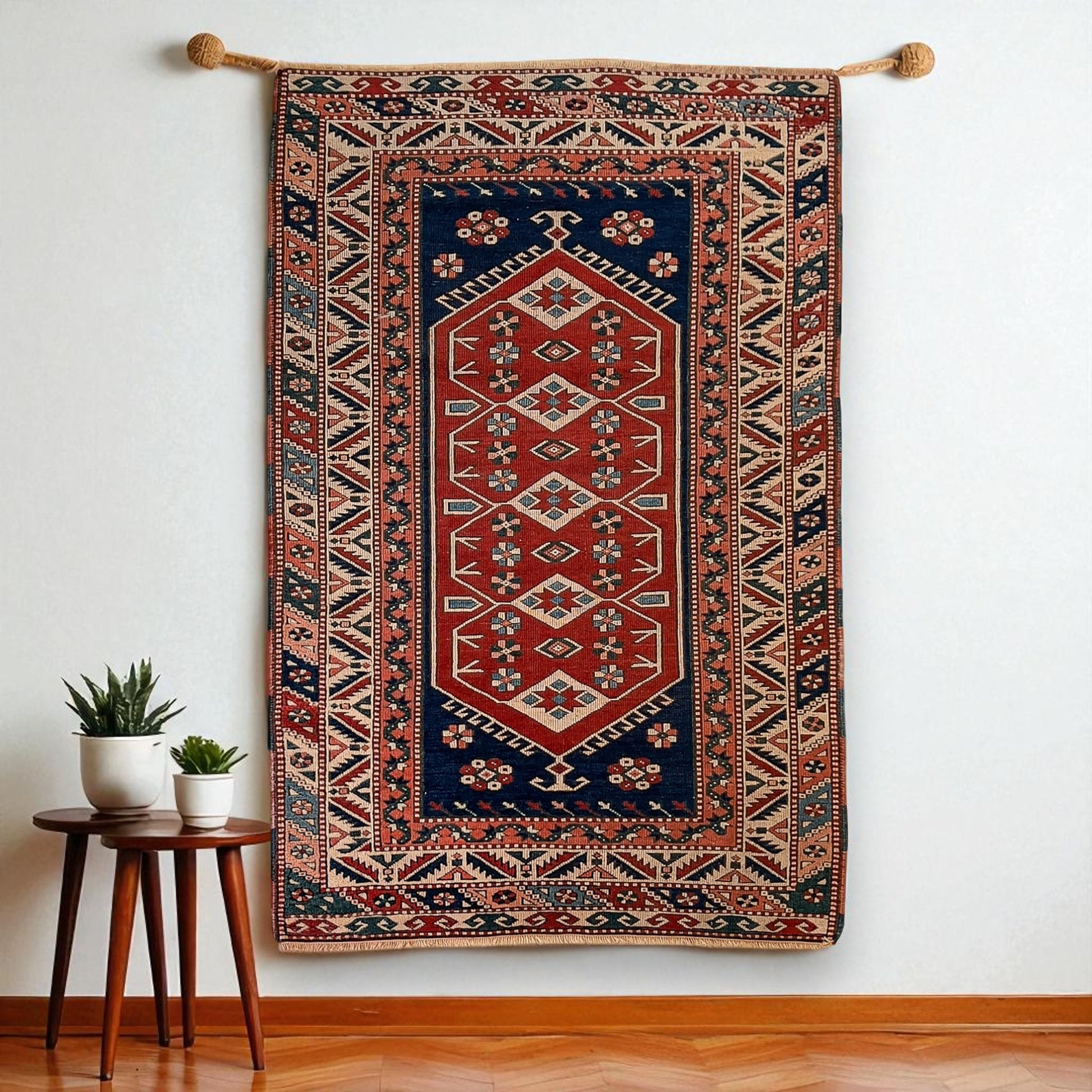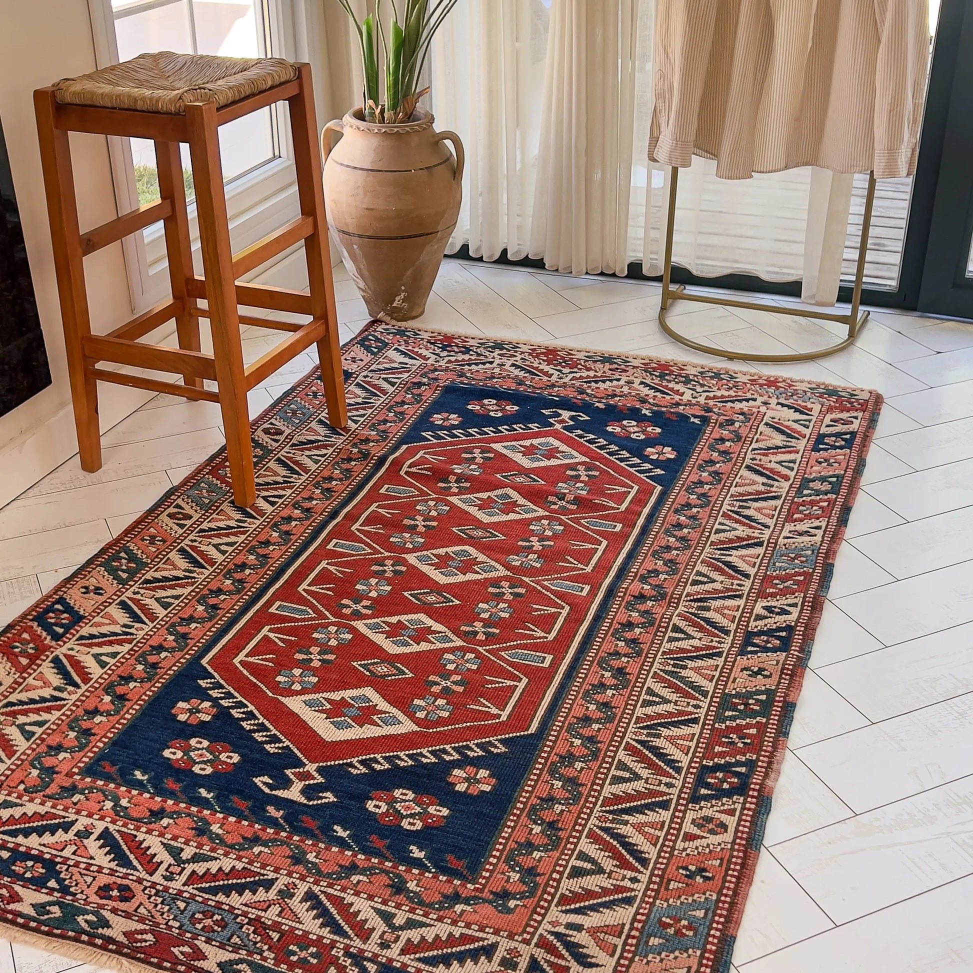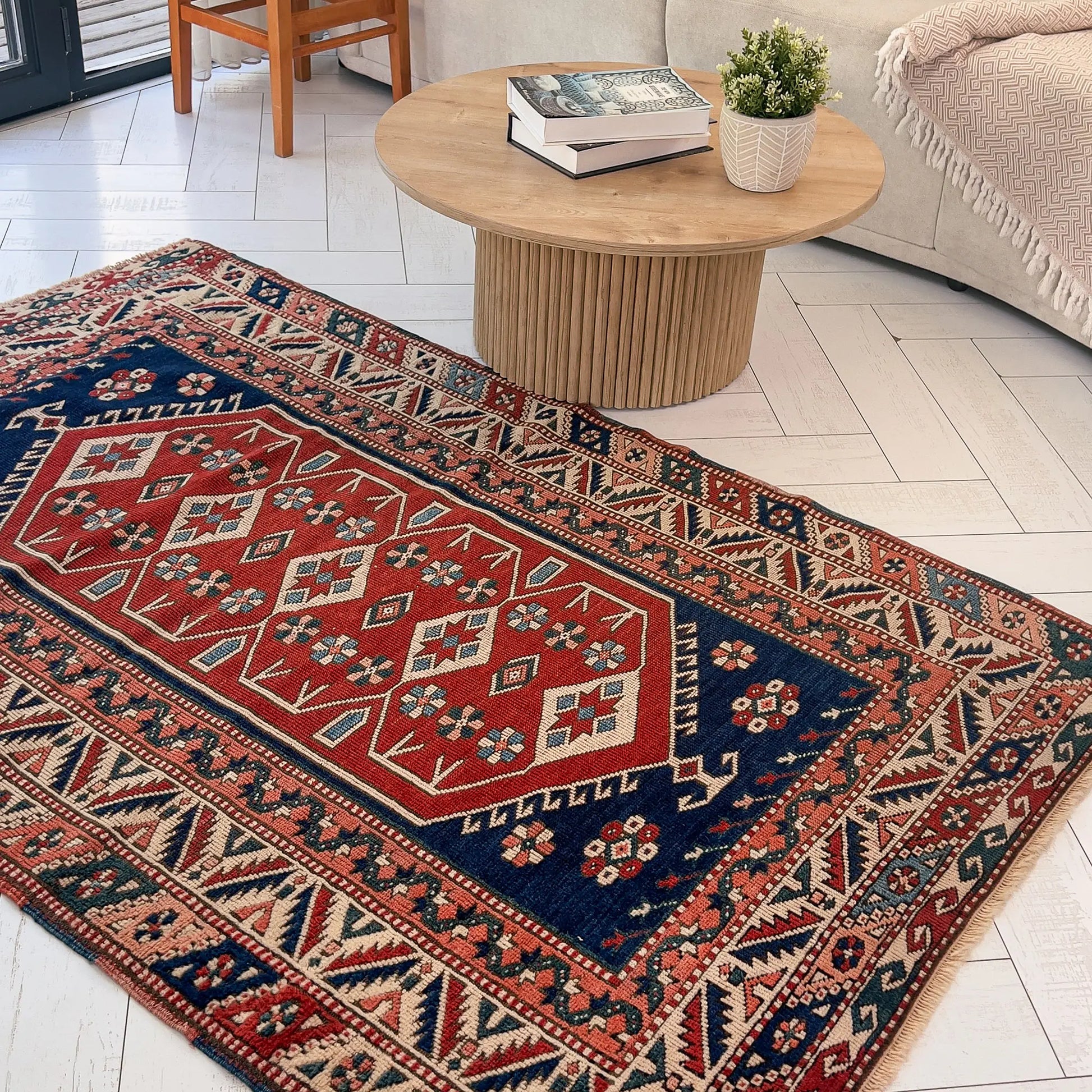 Batı Anadolu’nun göçebe ruhunu yansıtan Yörük halısı, madder kırmızısı–lacivert karşıtlığı ve kancalı geometrileriyle güçlü bir merkez etkisi yaratır. 190x120 cm ölçüsü salon ve oturma alanlarında sehpa altı için idealdir.