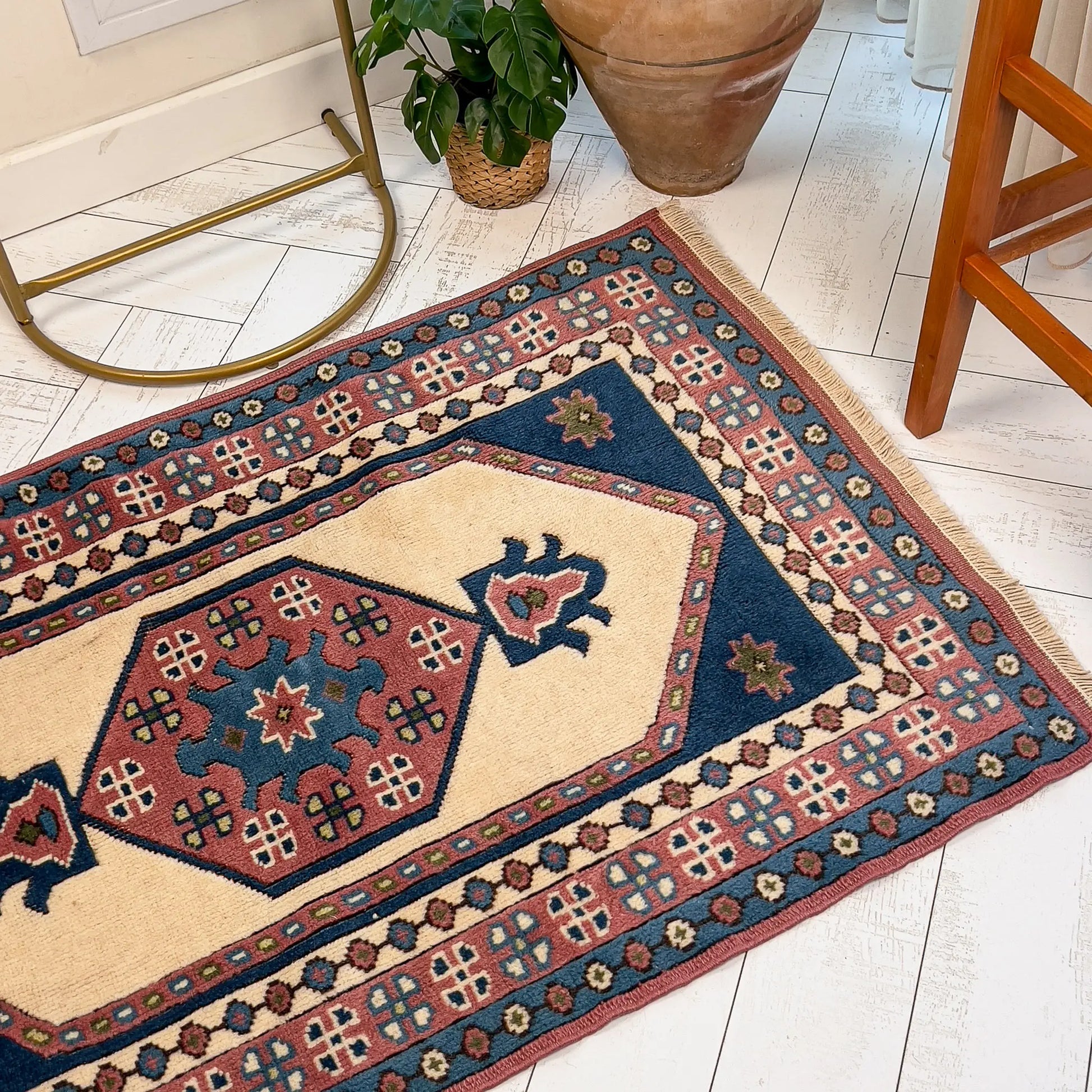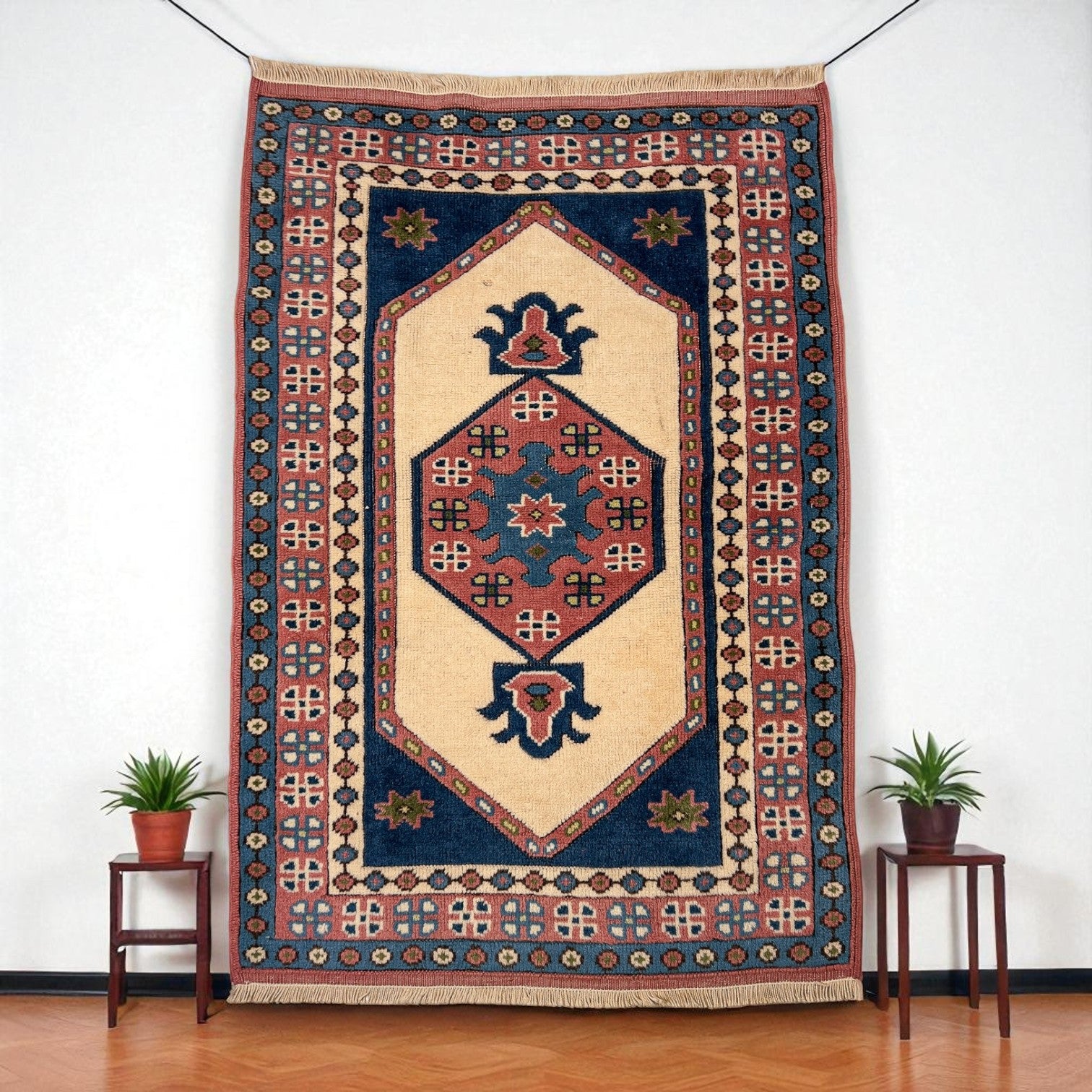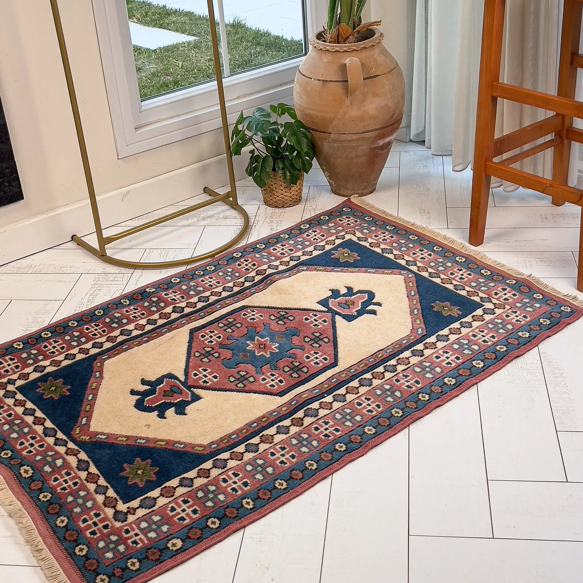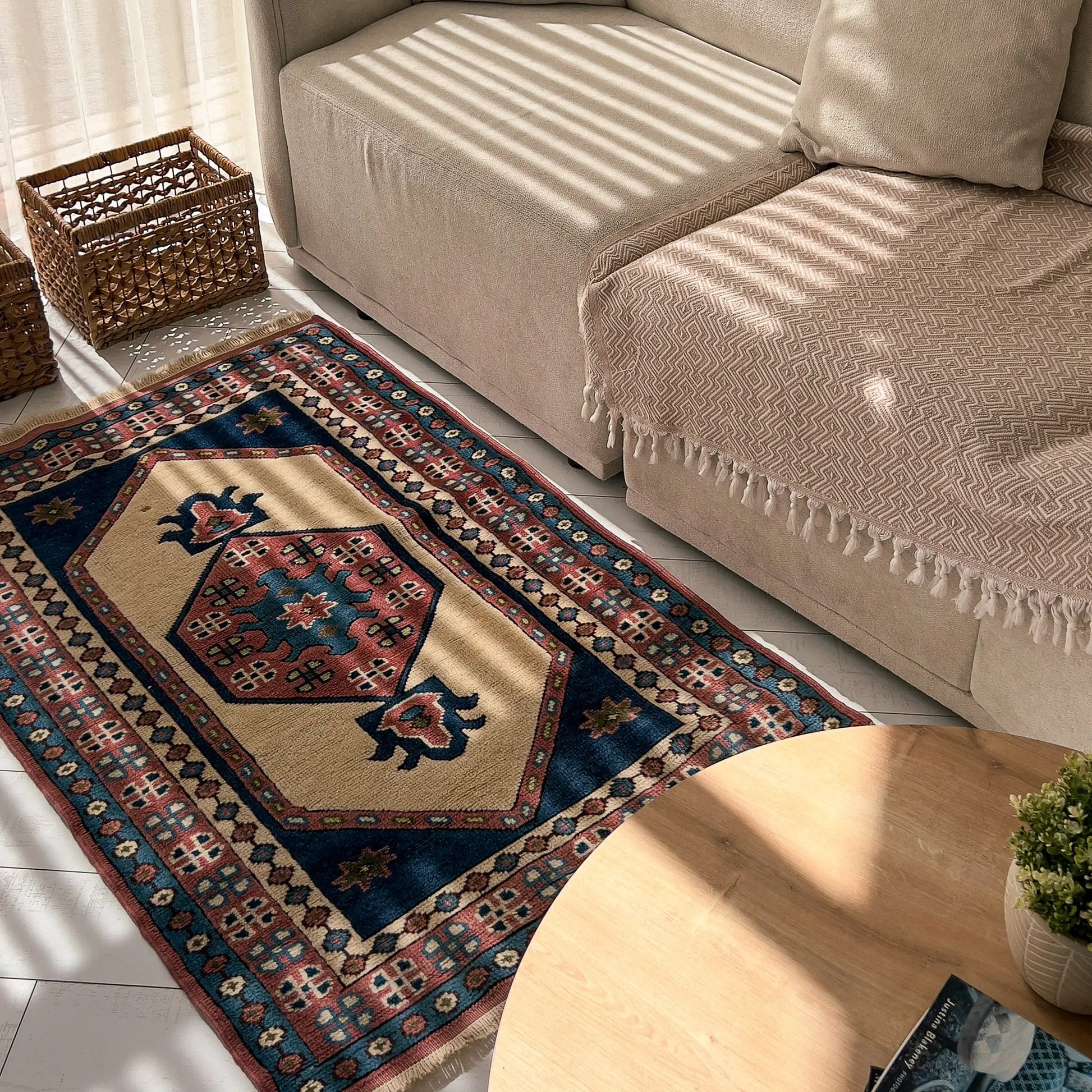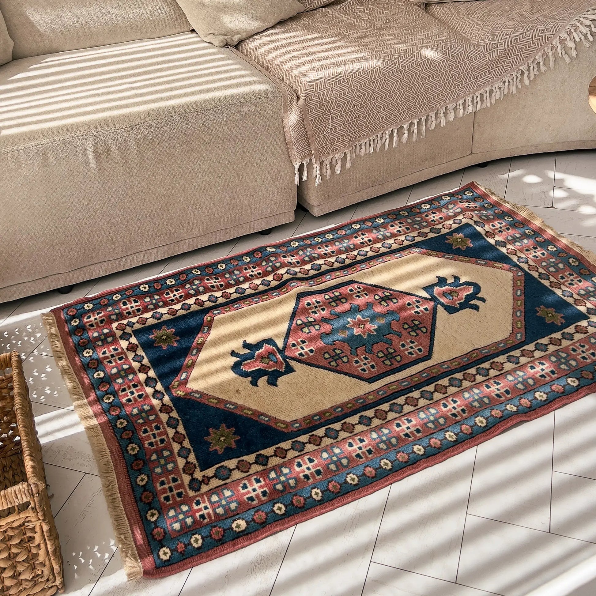 Krem, lacivert ve toprak kırmızısı tonlarıyla bu halı, Doğu’nun derin renklerini ve güçlü kontrastını taşır. Küçük alanlarda bile masalsı bir dokunuş yaratır, bulunduğu ortama hem otantik hem de zamansız bir hava katar.