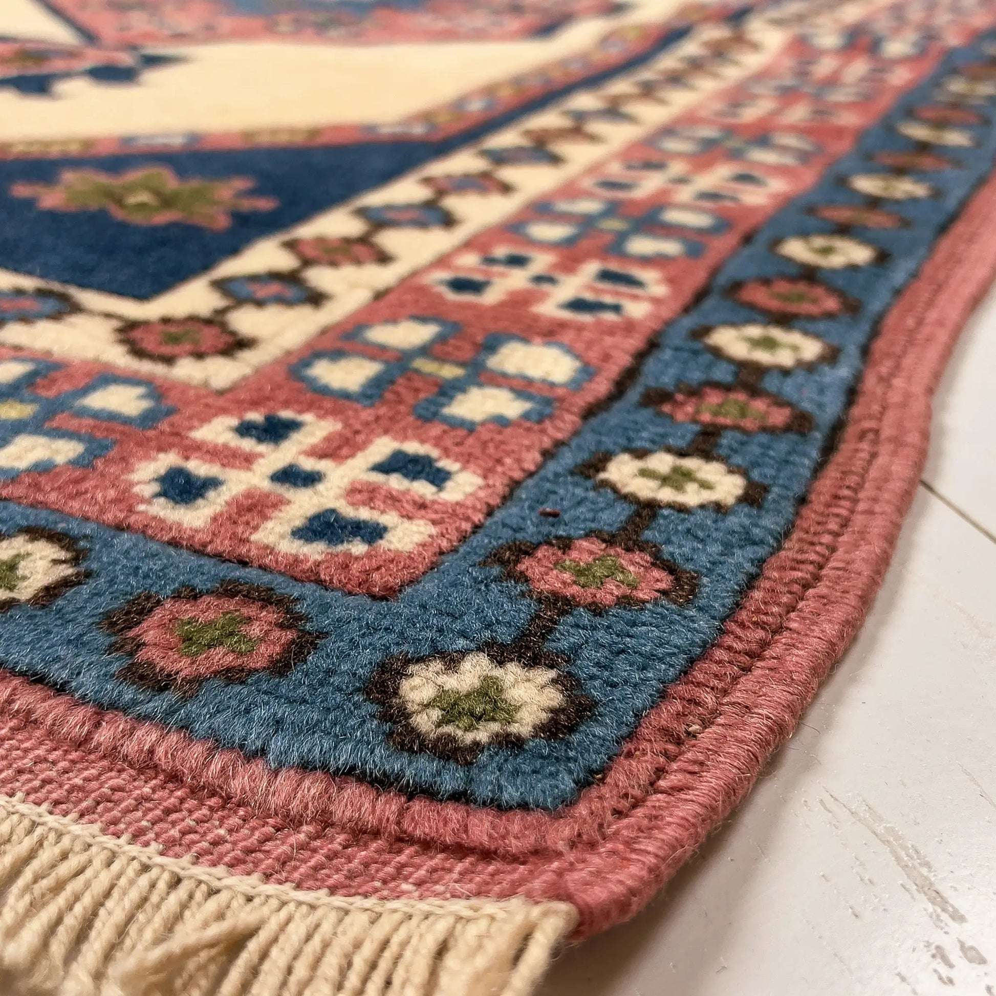 Kafkas etkili sembolik geometrileriyle öne çıkan bu Kars halısı, krem iç saha, gülkurusu bordürler ve lacivert/mavi alınlıklarla yumuşak ama derin bir kontrast kurar. 130x85 cm ölçüsü, giriş, konsol önü ya da duvar asımı için ideal bir küçük halı boyutudur.