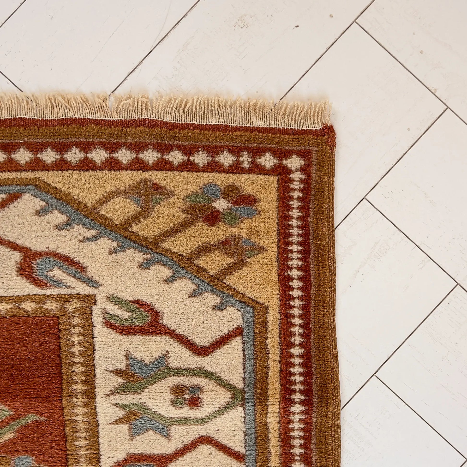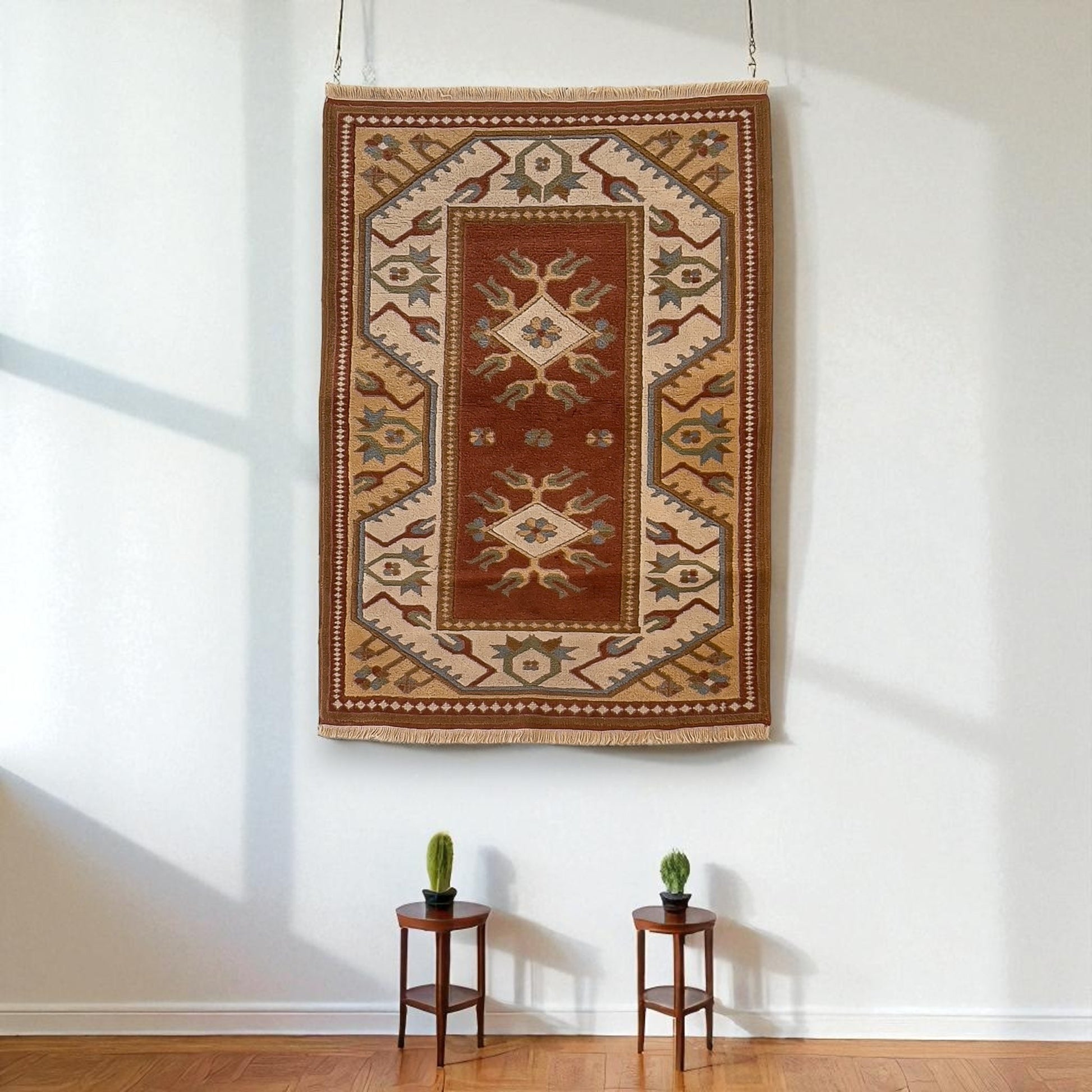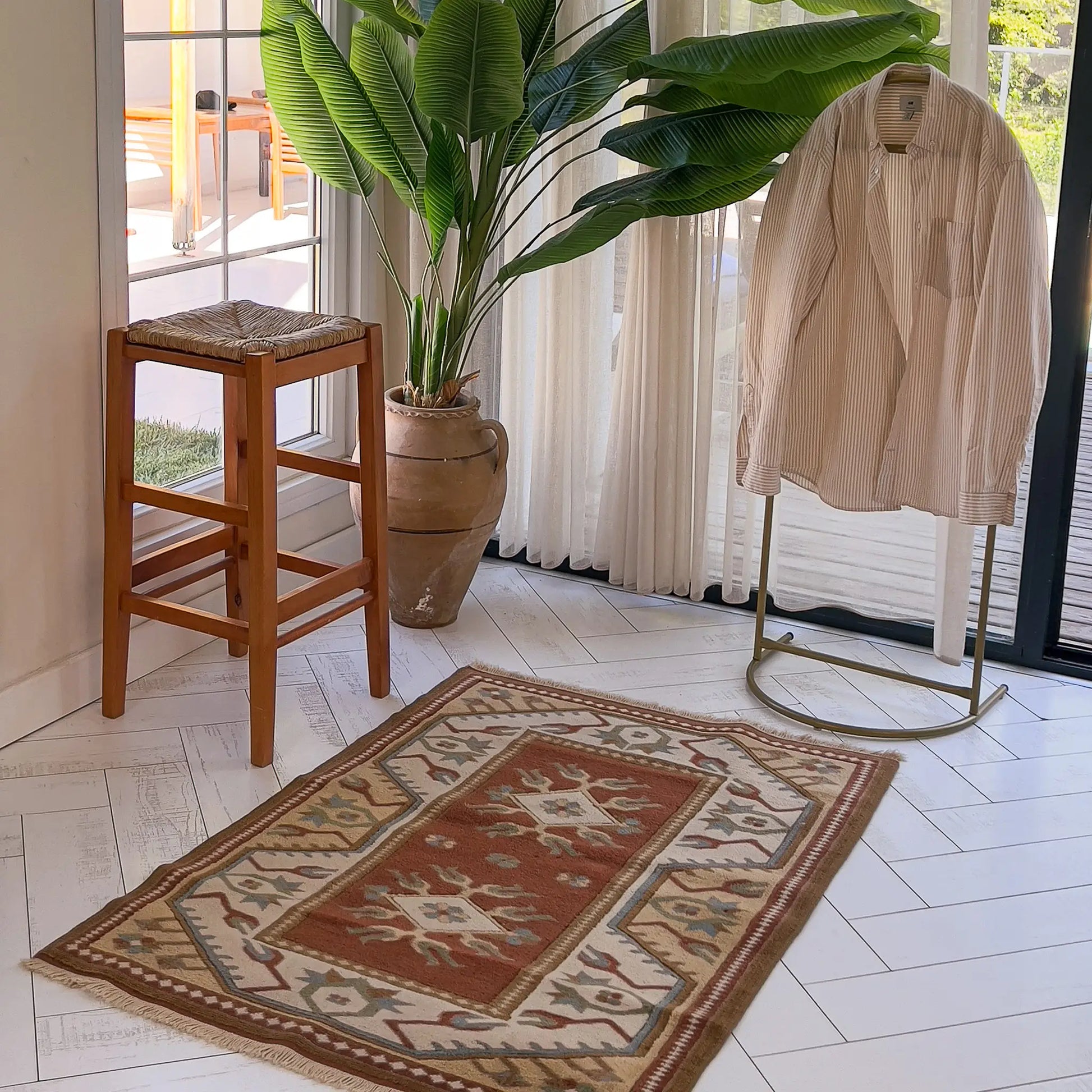 Toprak kırmızısı, krem ve yeşil tonlarıyla bu halı; hem rustik hem de huzurlu bir atmosfer sunuyor. Ege’nin doğallığını evlere taşıyan, küçük alanlarda bile sessiz bir masal gibi var olan bir parça.