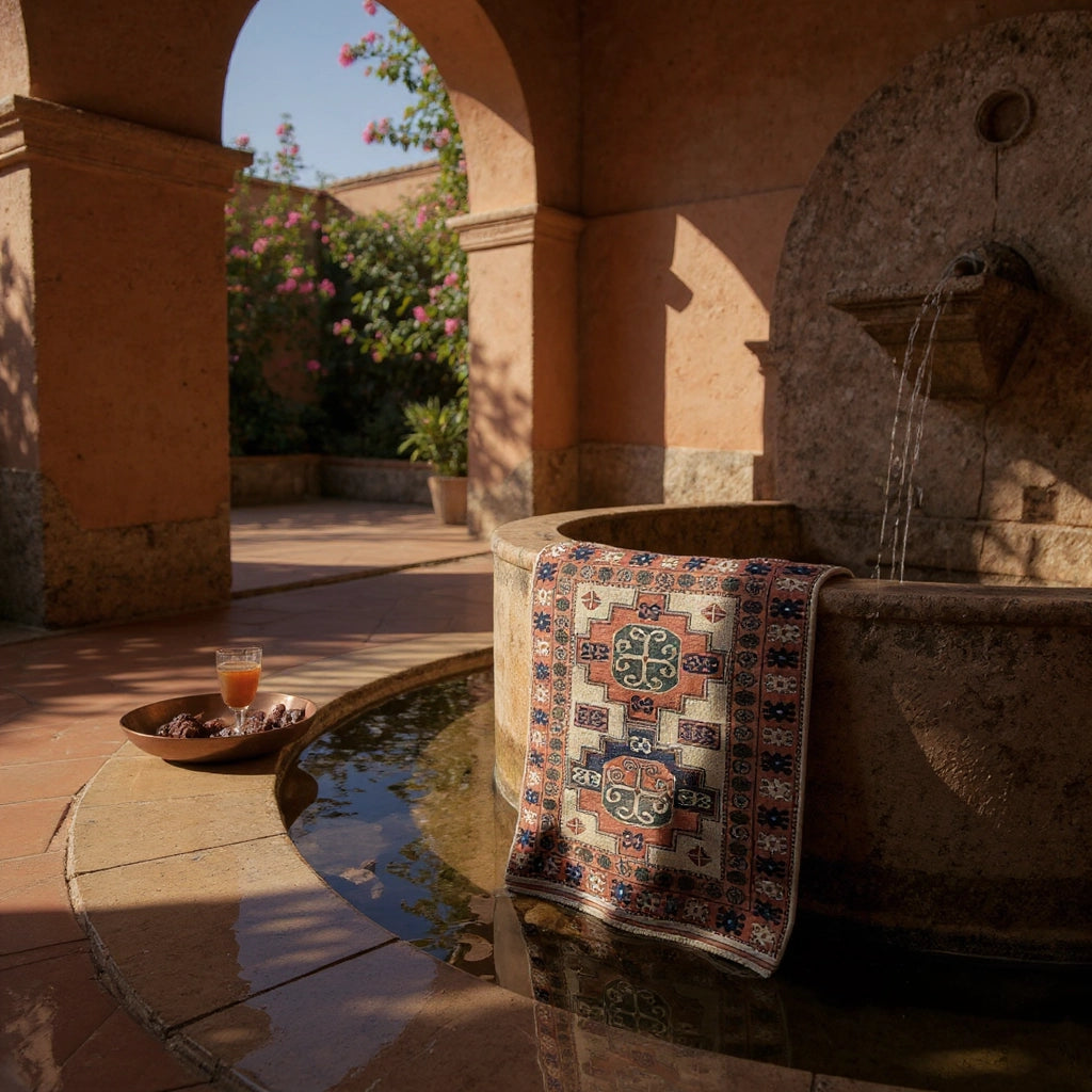 Bordürlerdeki su yolu ve yıldız motifleri, halının koruyucu çerçevesi gibidir: su, hayatın kaynağını; yıldızlar ise yolculukta rehberliği simgeler.