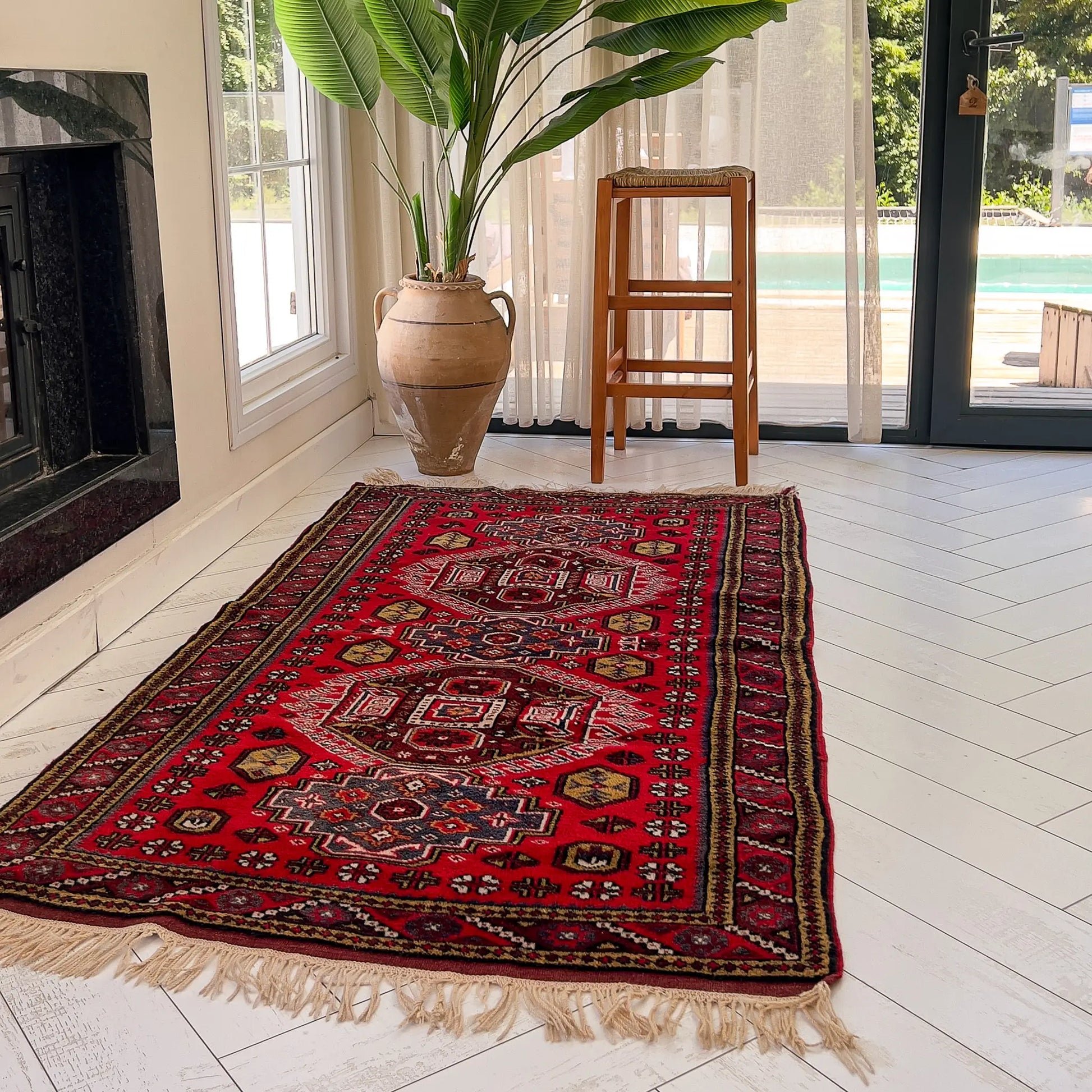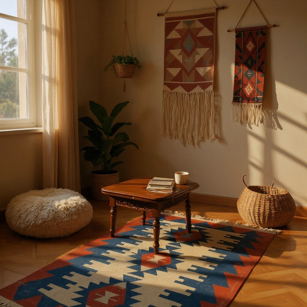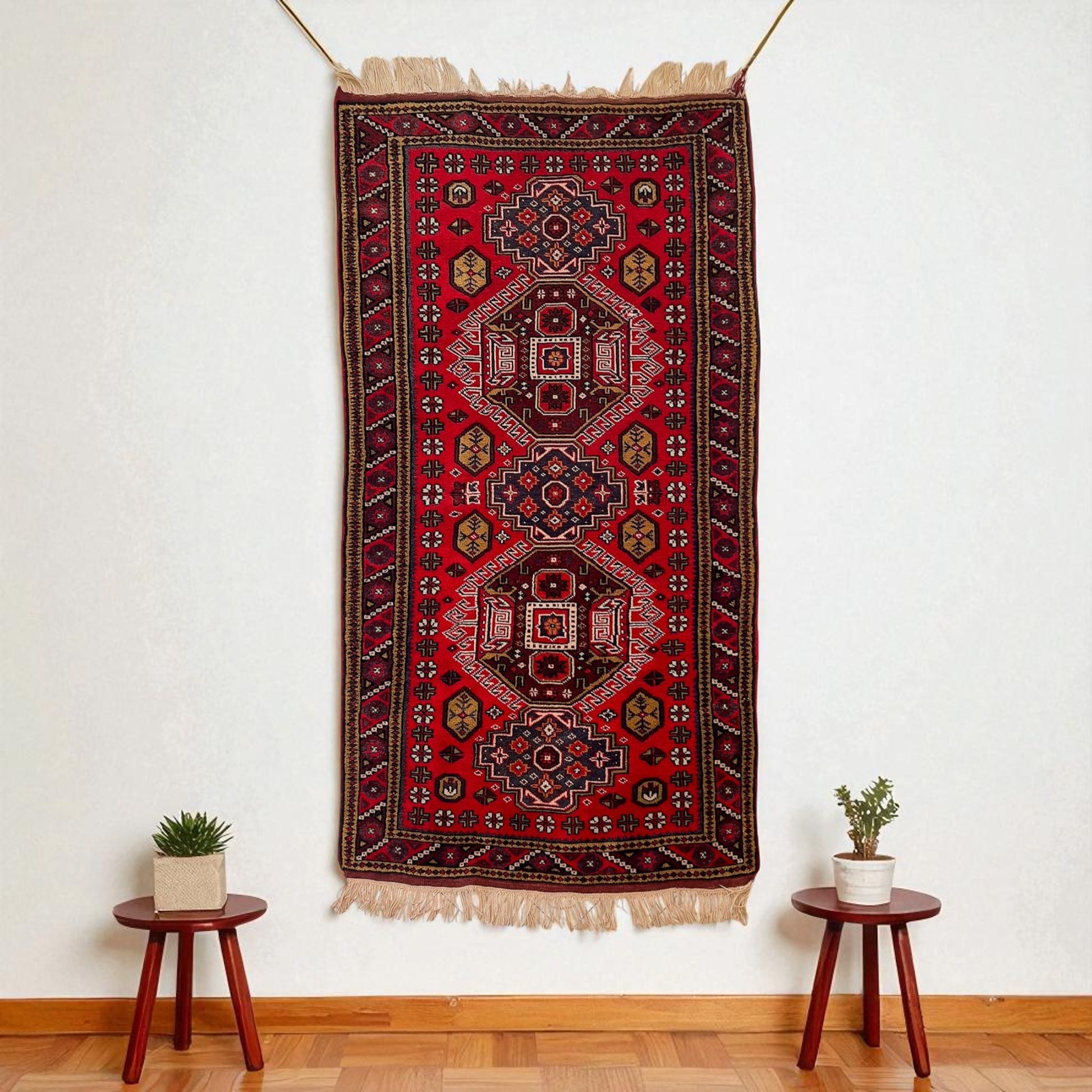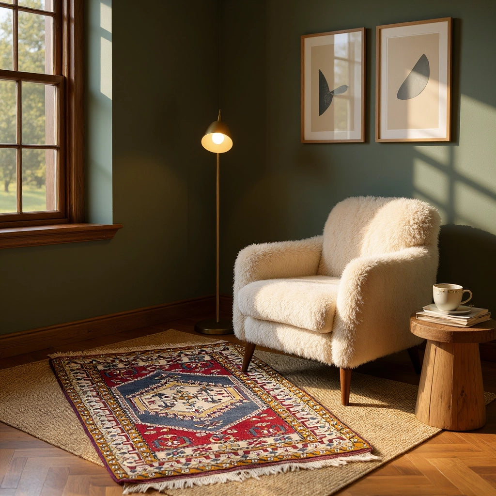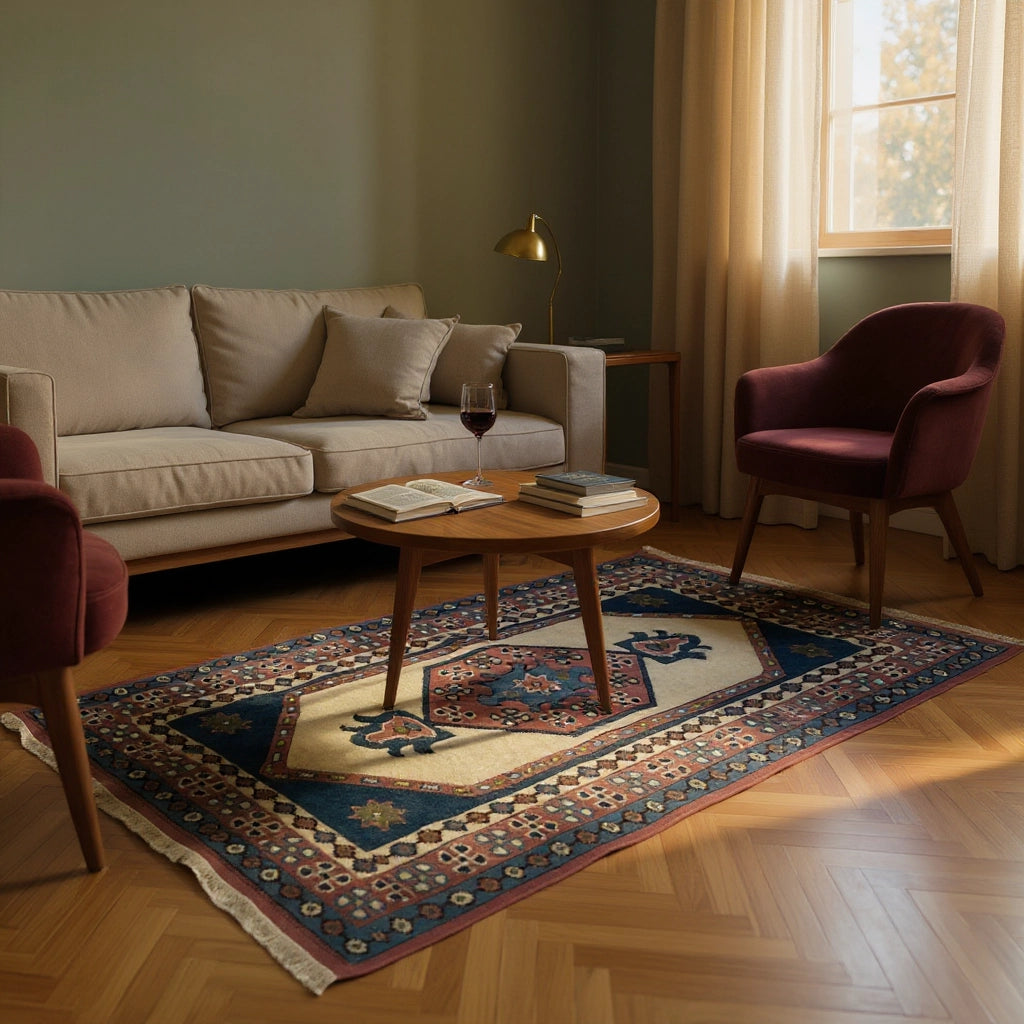 Yaklaşık 40 yıllık geçmişiyle özgün bir vintage halı olan İlîon, enerjisi yüksek paletiyle oturma odası ya da giriş alanında güçlü bir odak noktası oluşturur. Kırmızı ve lacivertin yoğun uyumu, doğal ahşap mobilyalar ve bej duvarlarla birleştiğinde mekâna karakterli bir şıklık katar. Hem kültürel değeri hem de uzun ömürlü yapısıyla öne çıkan özel bir Yağcıbedir yün halı modelidir.