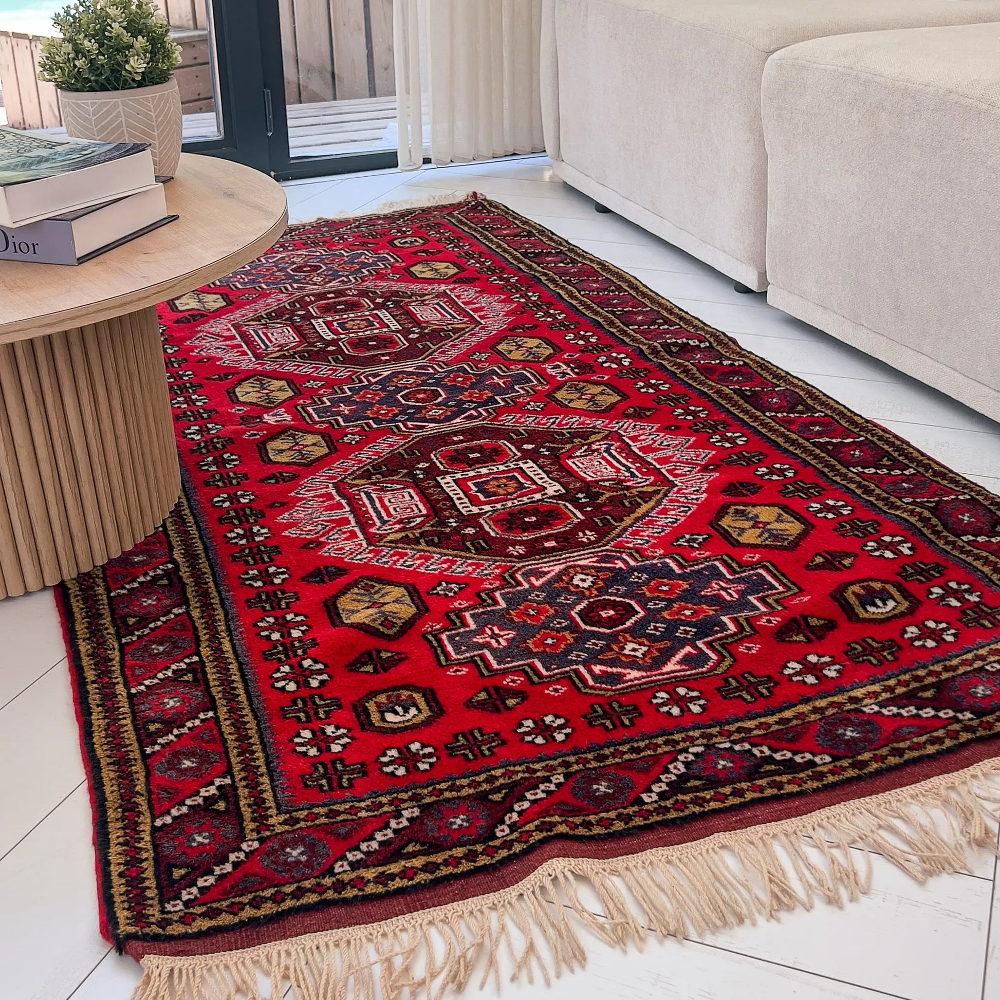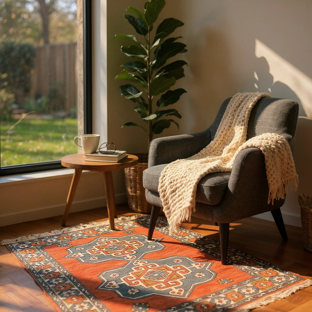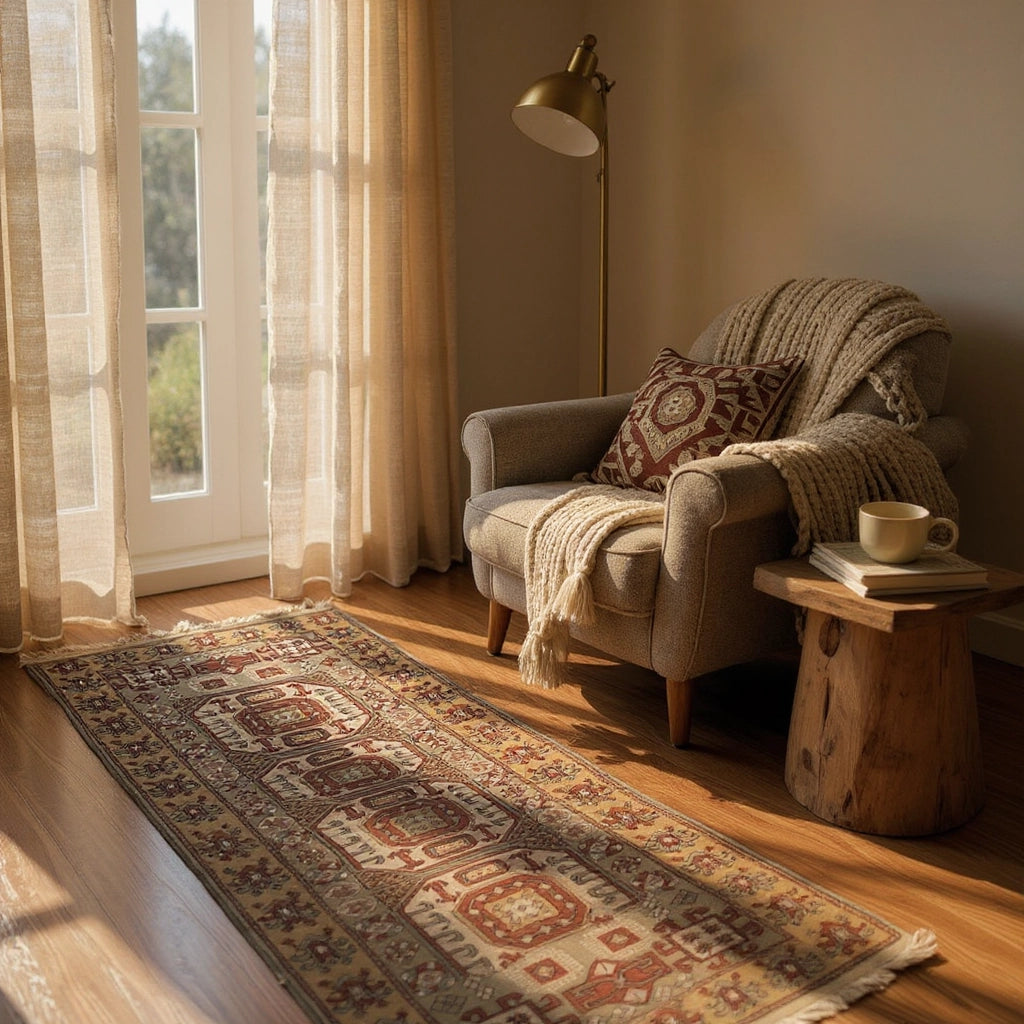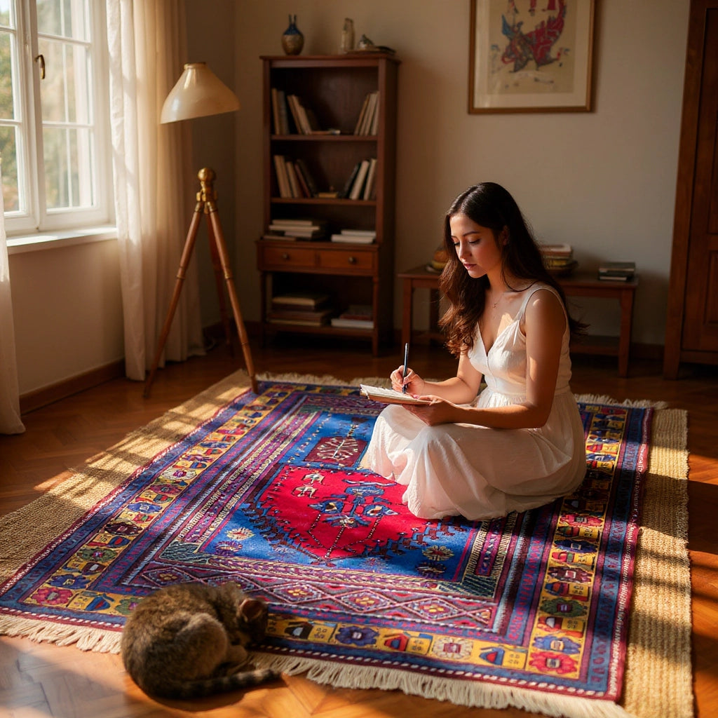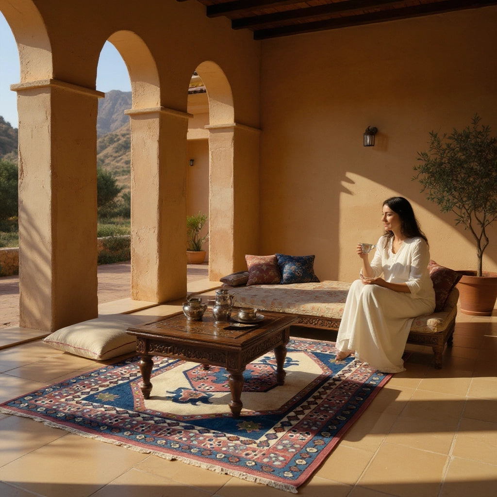 Yaklaşık 40 yıllık geçmişiyle özgün bir vintage halı olan İlîon, enerjisi yüksek paletiyle oturma odası ya da giriş alanında güçlü bir odak noktası oluşturur. Kırmızı ve lacivertin yoğun uyumu, doğal ahşap mobilyalar ve bej duvarlarla birleştiğinde mekâna karakterli bir şıklık katar. Hem kültürel değeri hem de uzun ömürlü yapısıyla öne çıkan özel bir Yağcıbedir yün halı modelidir.