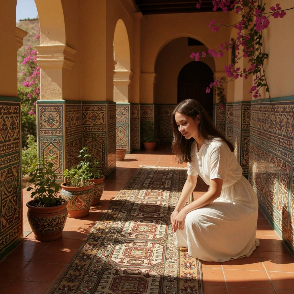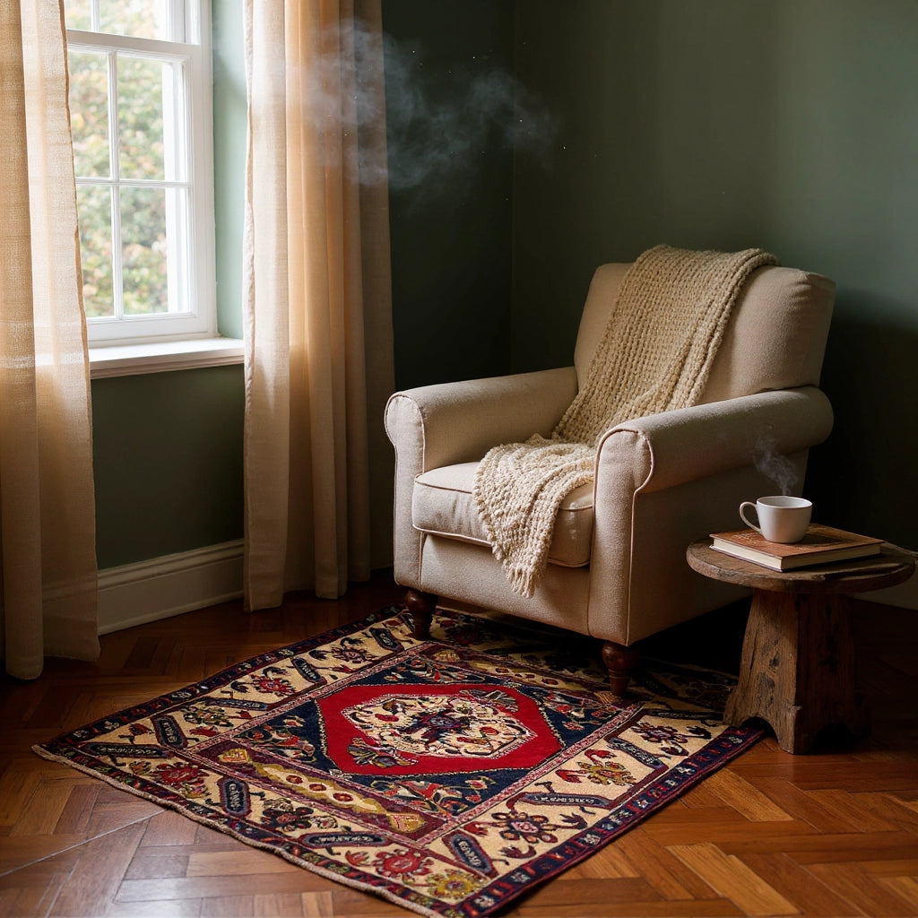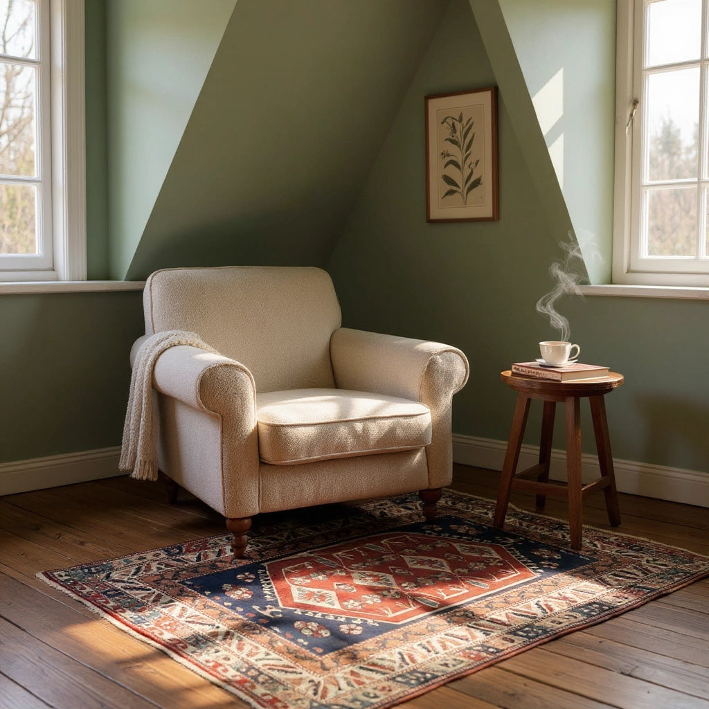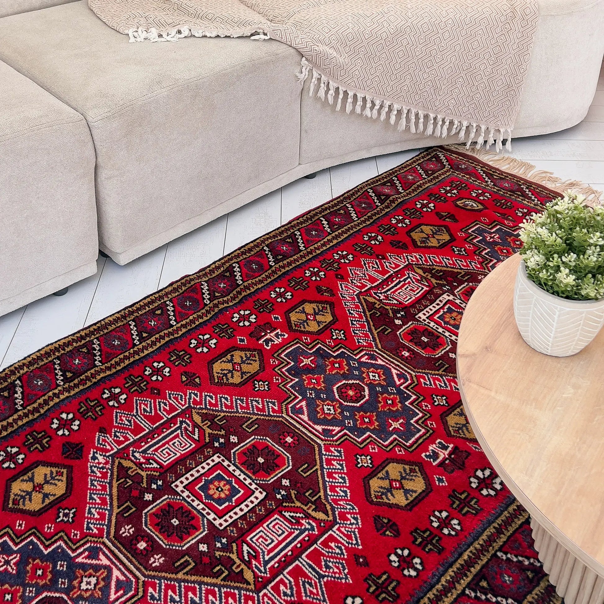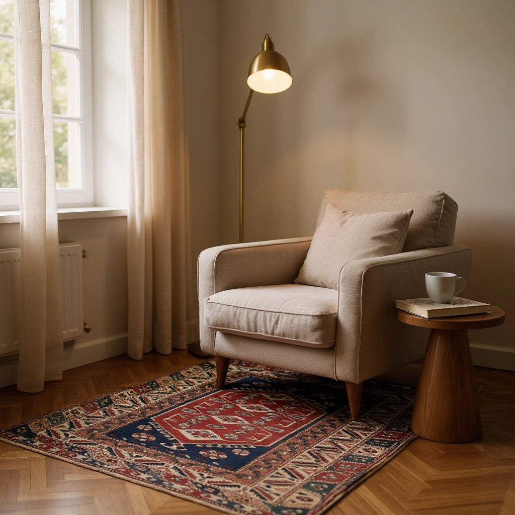 Yaklaşık 40 yıllık geçmişiyle özgün bir vintage halı olan İlîon, enerjisi yüksek paletiyle oturma odası ya da giriş alanında güçlü bir odak noktası oluşturur. Kırmızı ve lacivertin yoğun uyumu, doğal ahşap mobilyalar ve bej duvarlarla birleştiğinde mekâna karakterli bir şıklık katar. Hem kültürel değeri hem de uzun ömürlü yapısıyla öne çıkan özel bir Yağcıbedir yün halı modelidir.