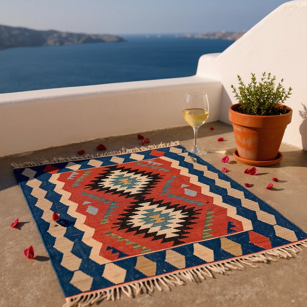 Yağcıbedir etkisini taşıyan Sındırgı dokumalarında kırmızı–lacivert–beyaz üçlüsü, koruyucu bir anlatı kurar. Bu parçada medalyonların kalbindeki çengel/koçboynuzu gücü ve bereketi çağırırken, yıldız serileri iyi talihi işler. Zikzak–meander akışı, halının sınırını koruyan bir hat gibi çevreler. Sonuç, hareket ve korumanın aynı yüzeyde buluştuğu, canlı ve cesur bir Yörük yorumudur.