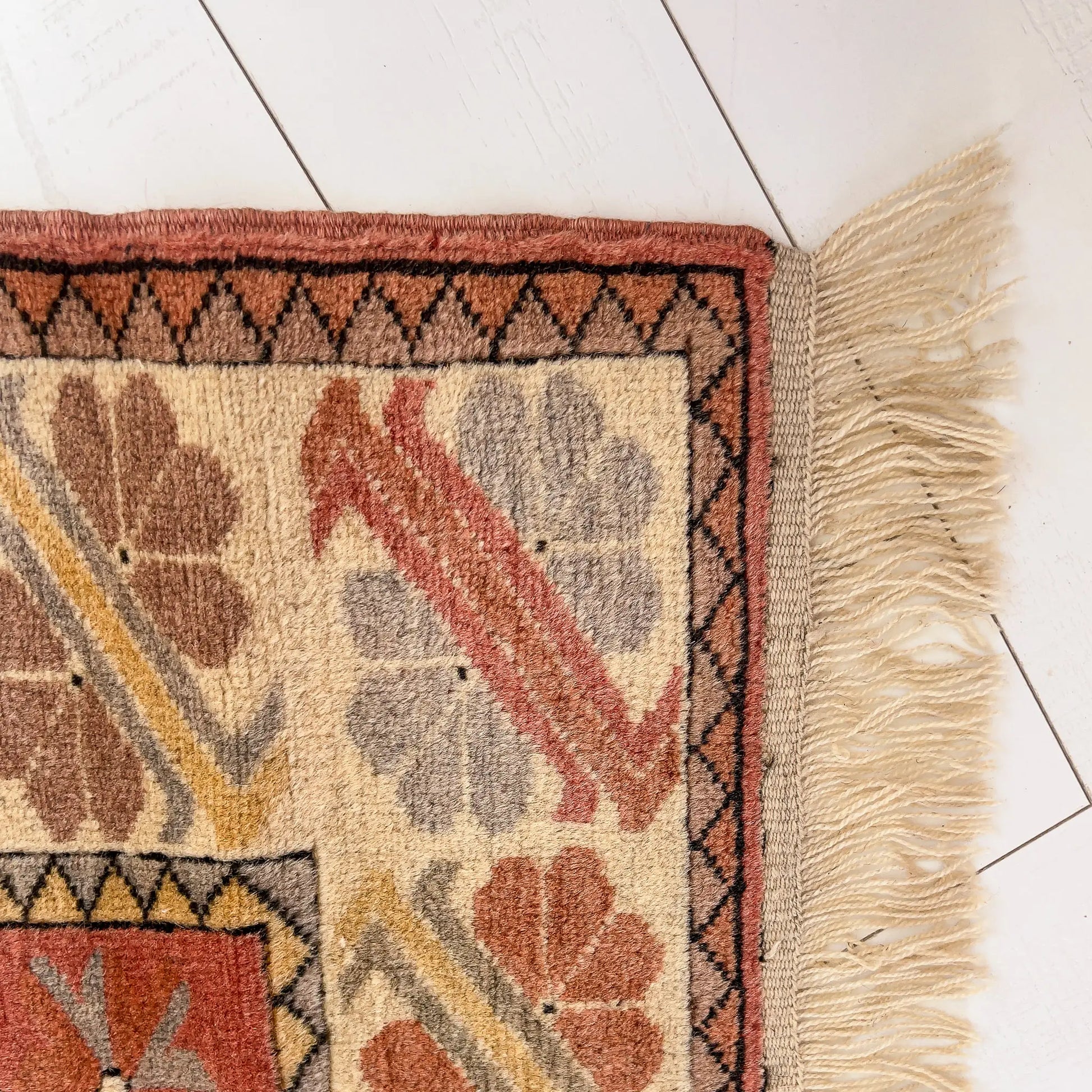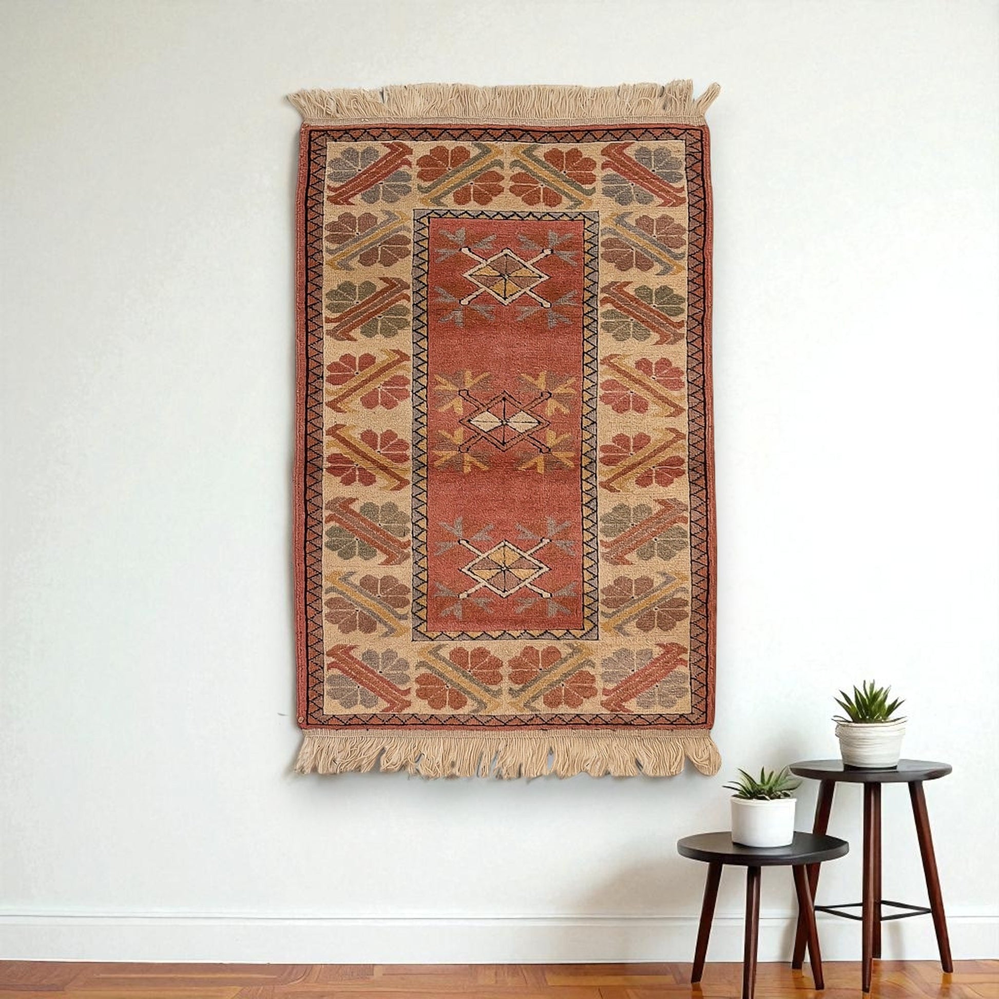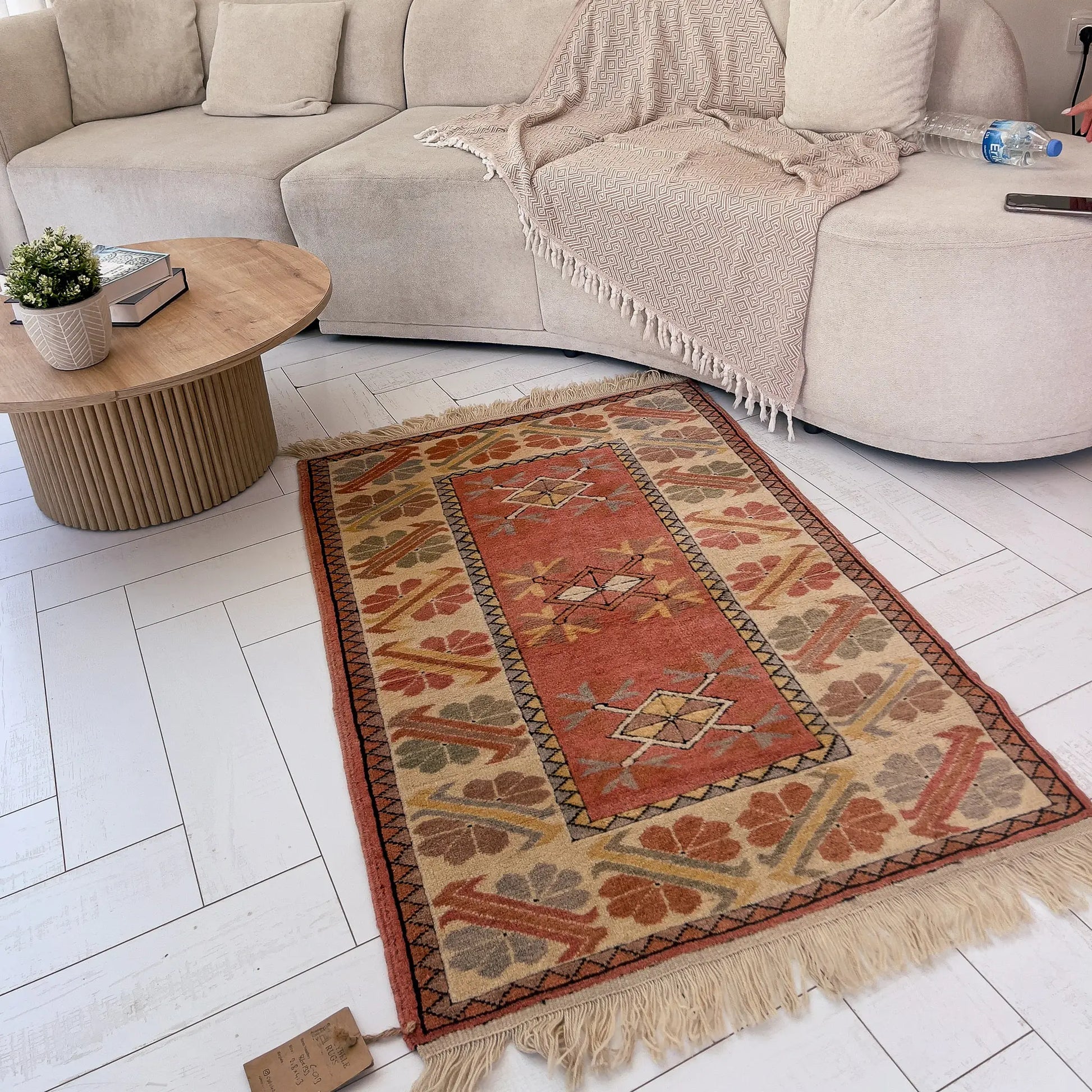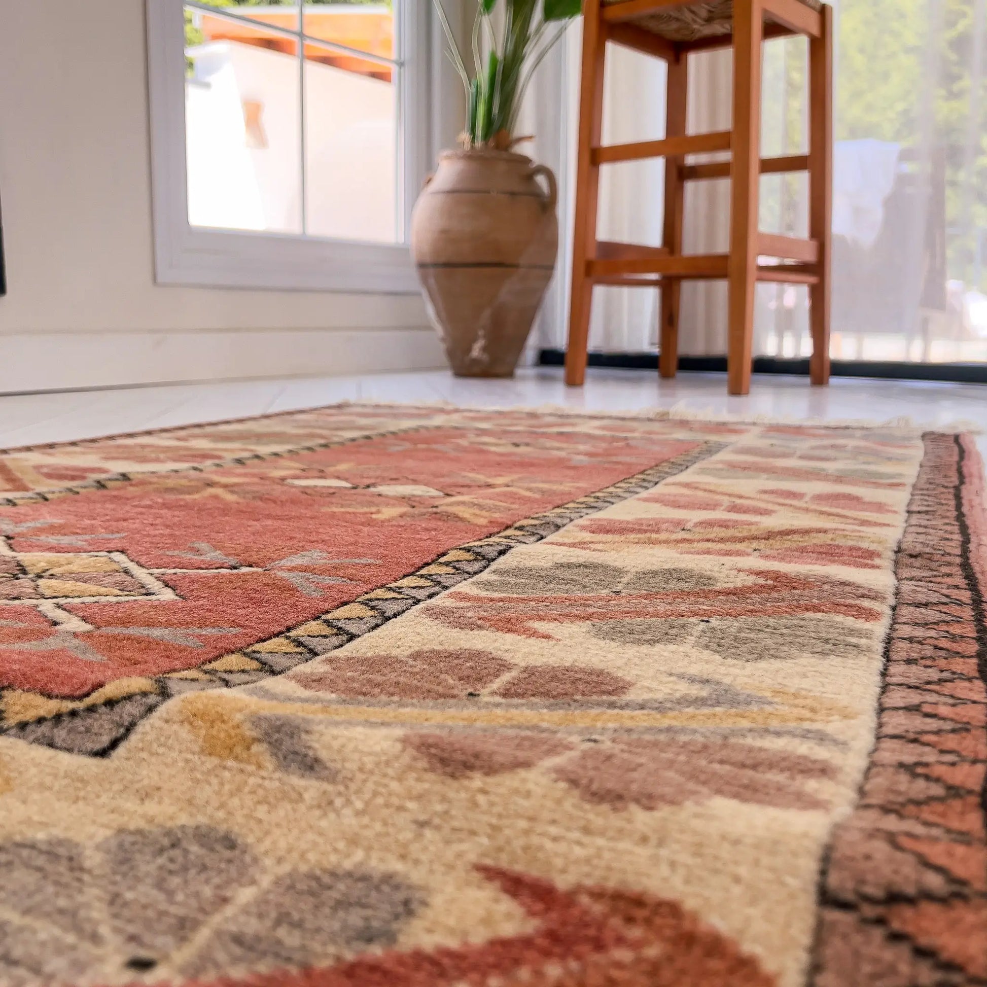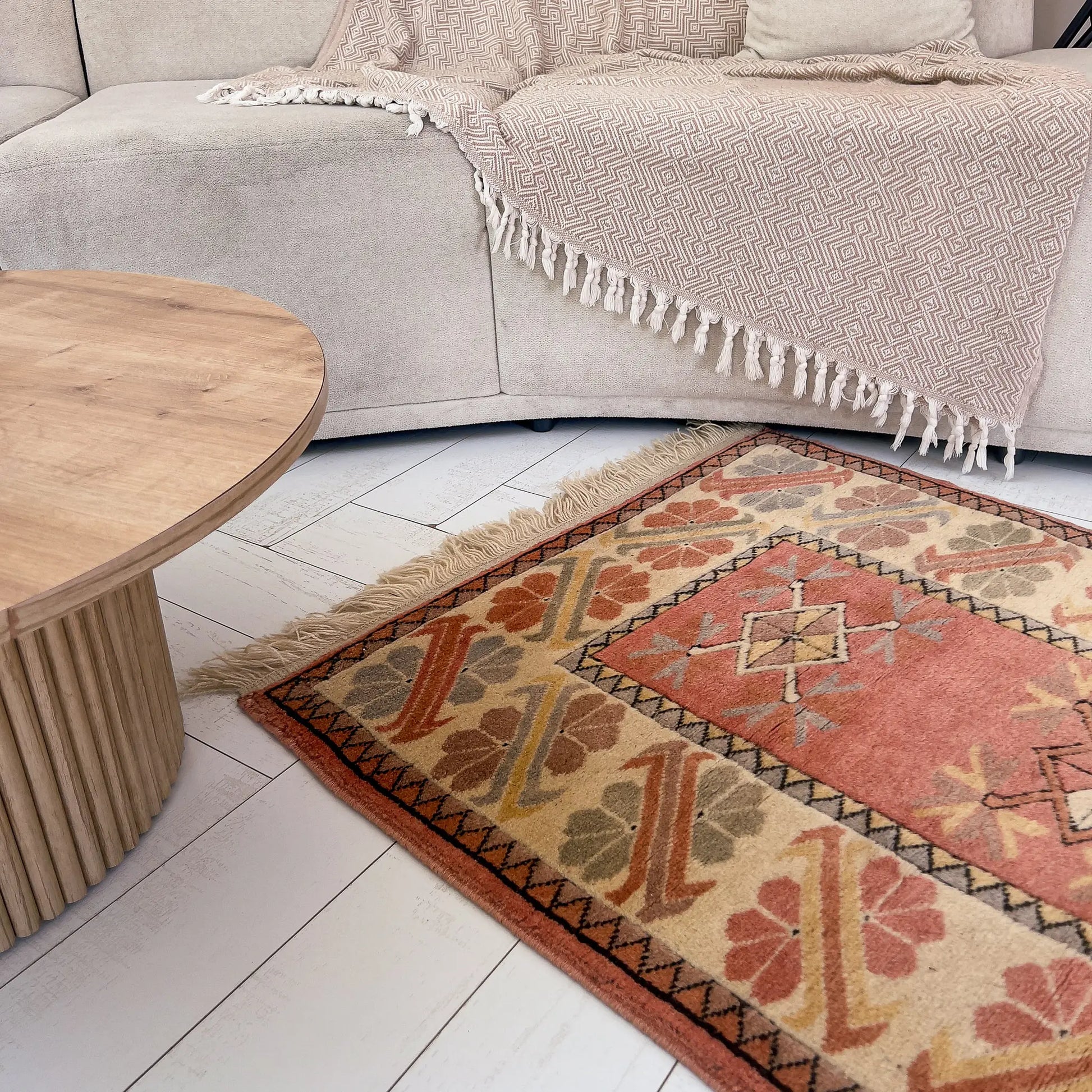 Ege’nin dingin ruhunu taşıyan bu Milas el dokuma halı, gülkurusuna çalan terracotta zemini ve geniş krem bordürüyle zarif bir ifade sunar. 133x85 cm ölçüsü, küçük alanlarda ya da yatak ucu gibi özel köşelerde sıcak bir odak yaratmak için idealdir.