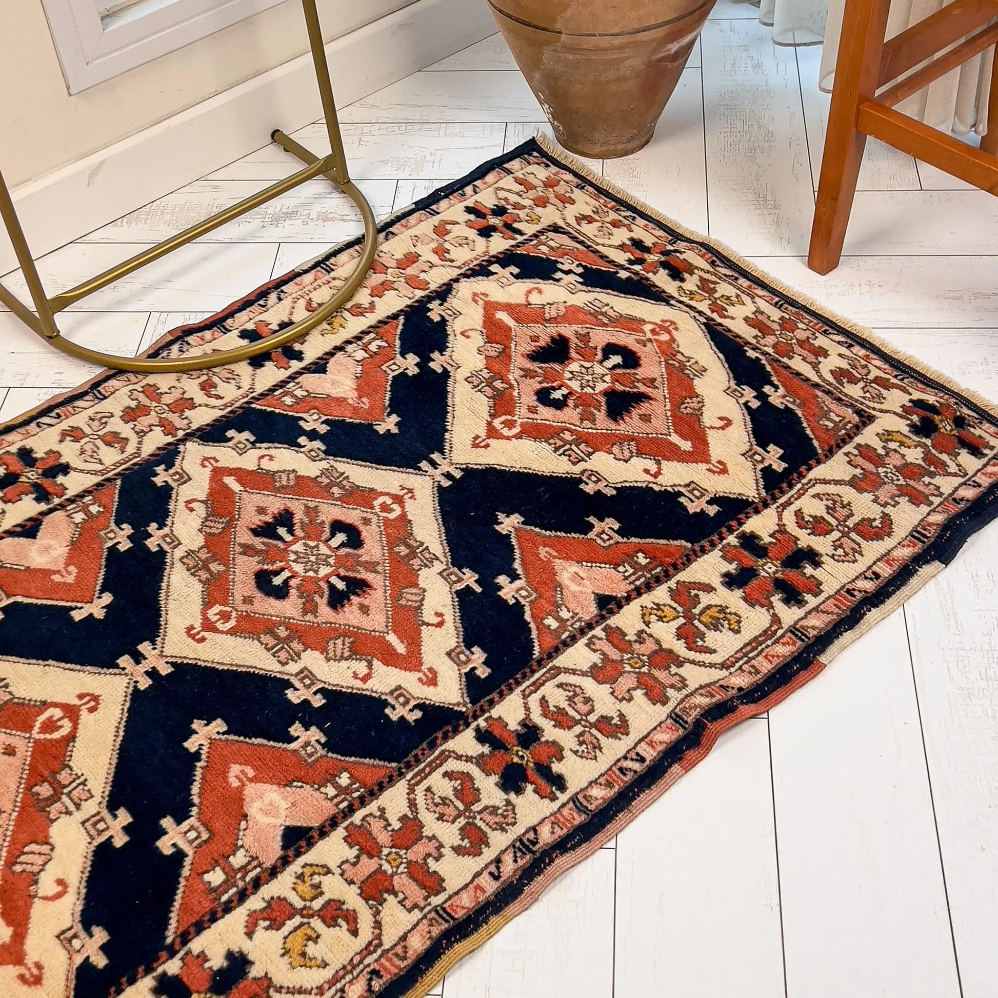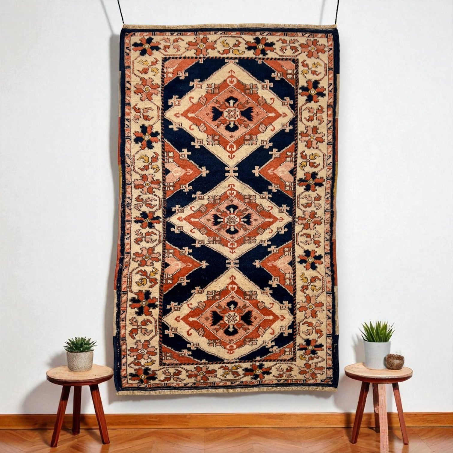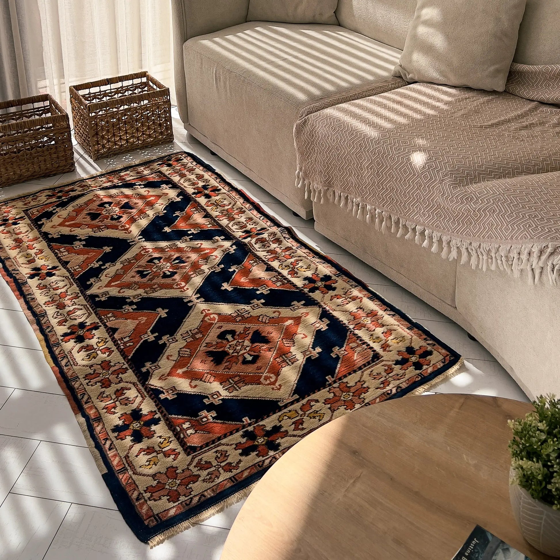 Göçebe üslubun dinamik karakterini taşıyan Yörük halısı, derin lacivert zeminde somon–terrakotta medalyonları ve krem açıklıklarıyla güçlü bir enerji verir. 155x90 cm ölçüsü, salon, çalışma alanı veya girişte odak kurmak için idealdir.