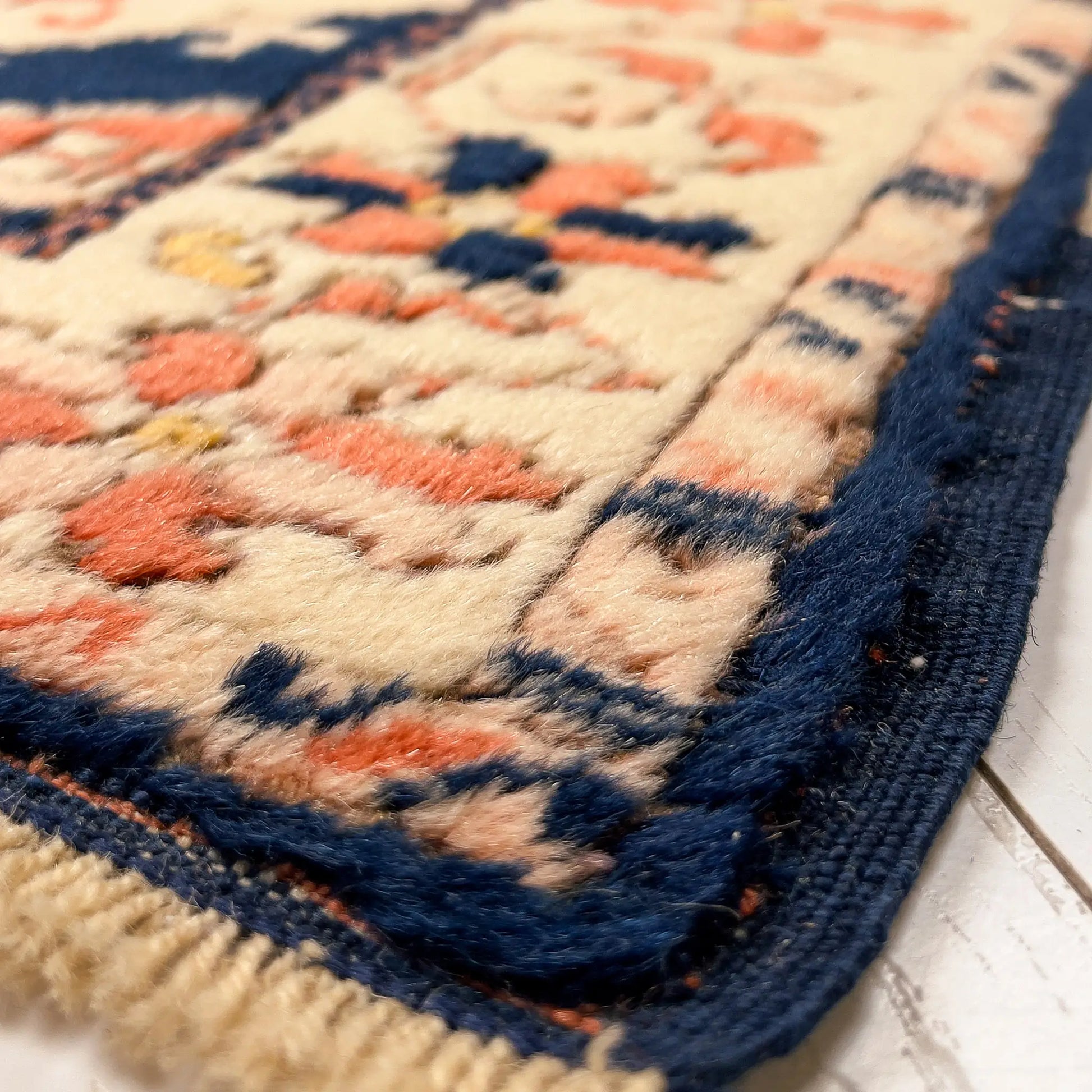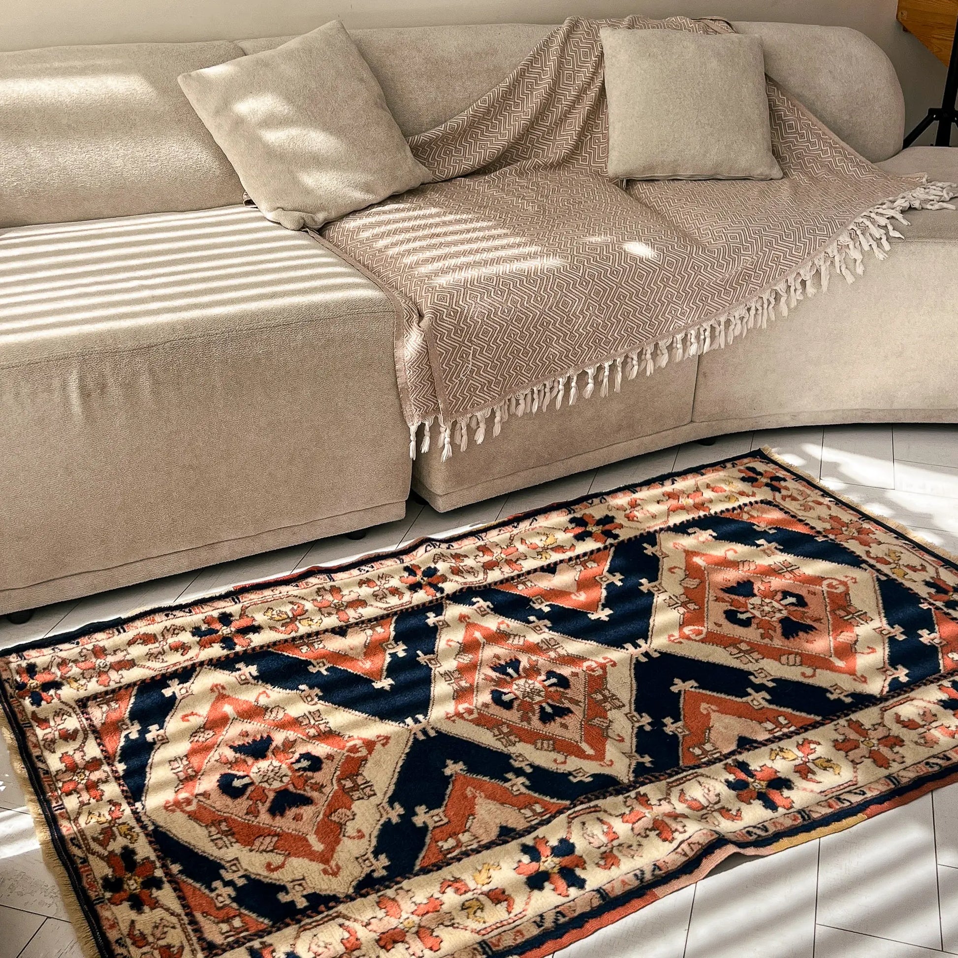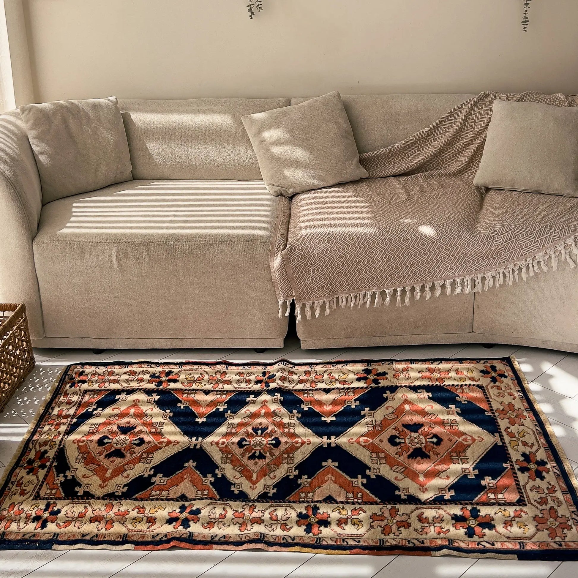Göçebe üslubun dinamik karakterini taşıyan Yörük halısı, derin lacivert zeminde somon–terrakotta medalyonları ve krem açıklıklarıyla güçlü bir enerji verir. 155x90 cm ölçüsü, salon, çalışma alanı veya girişte odak kurmak için idealdir.