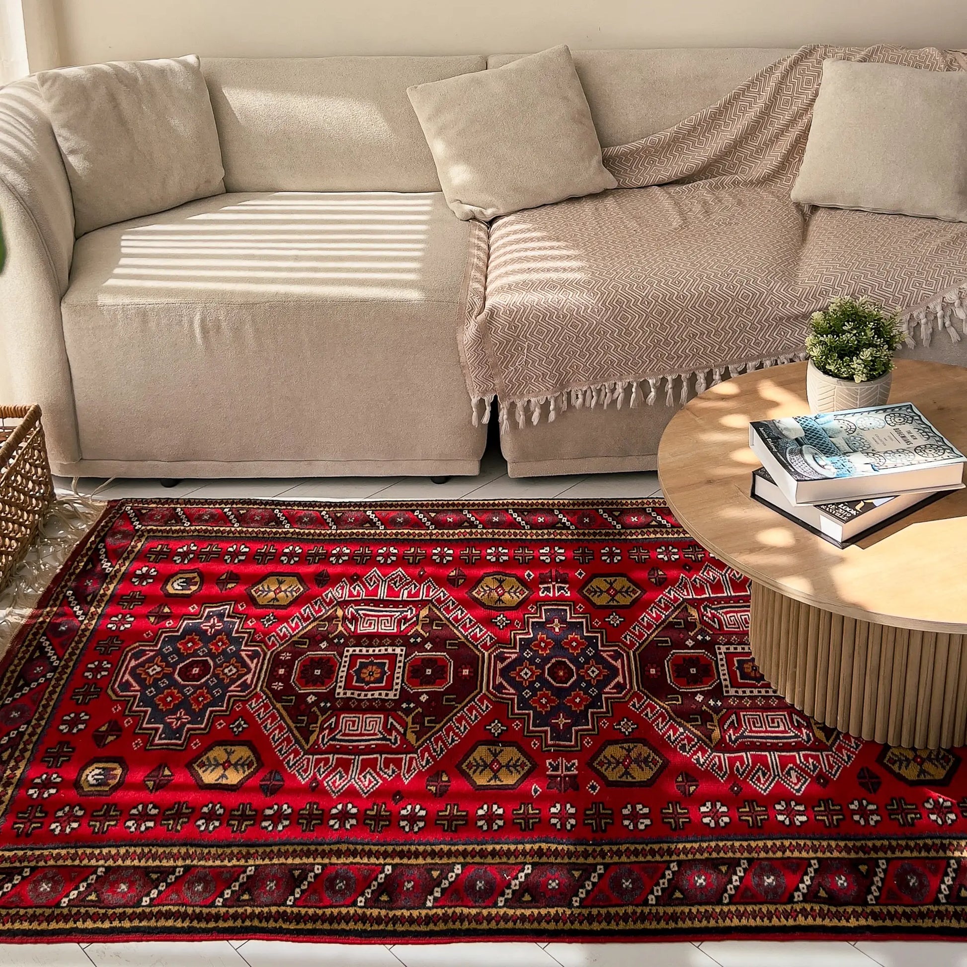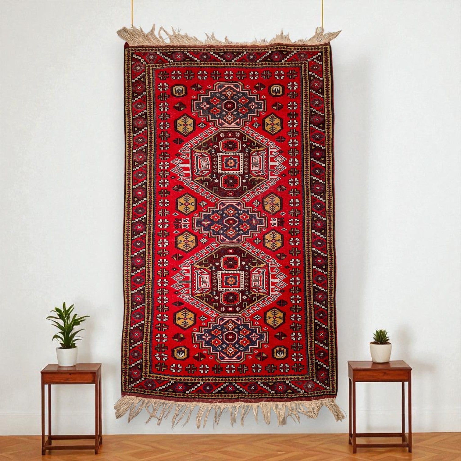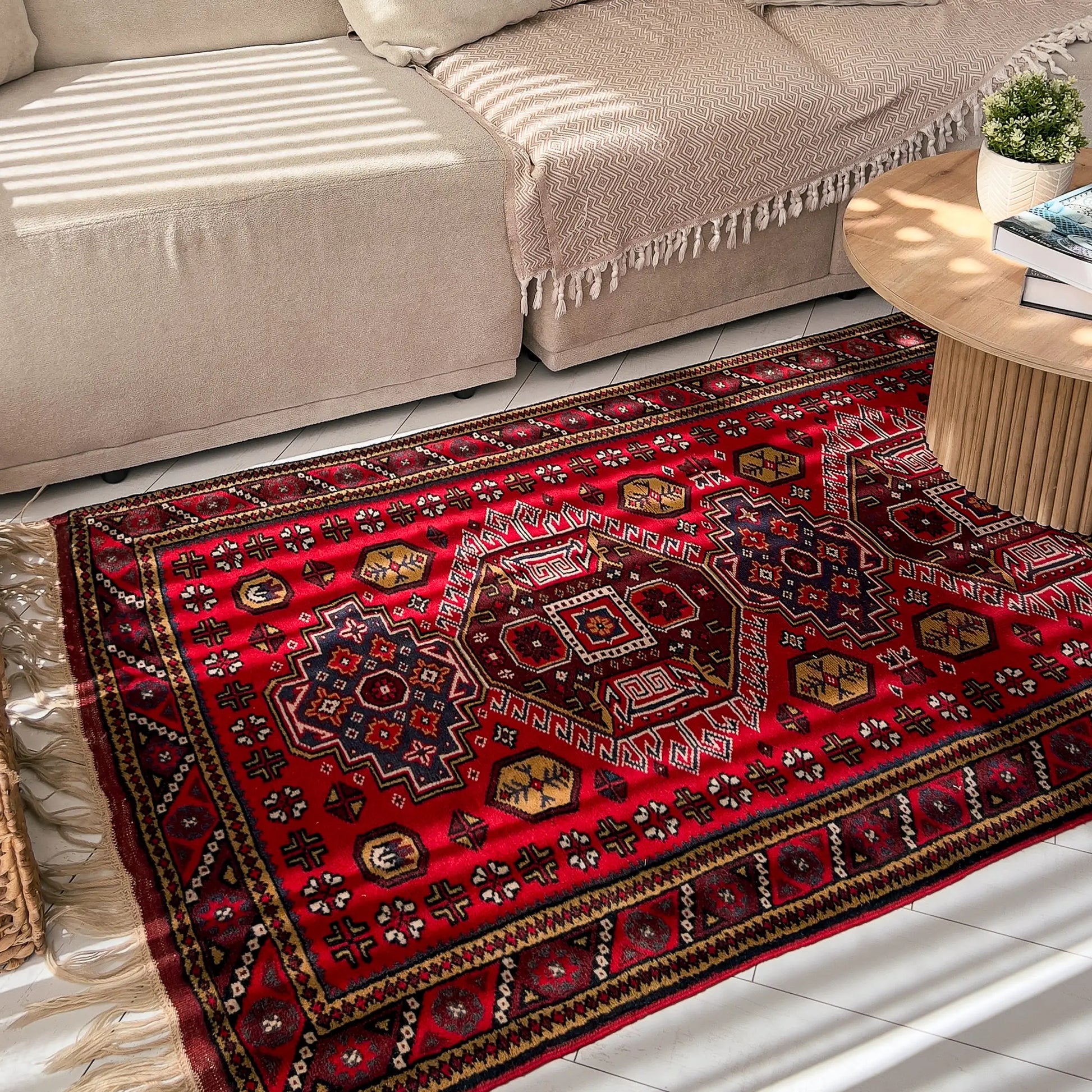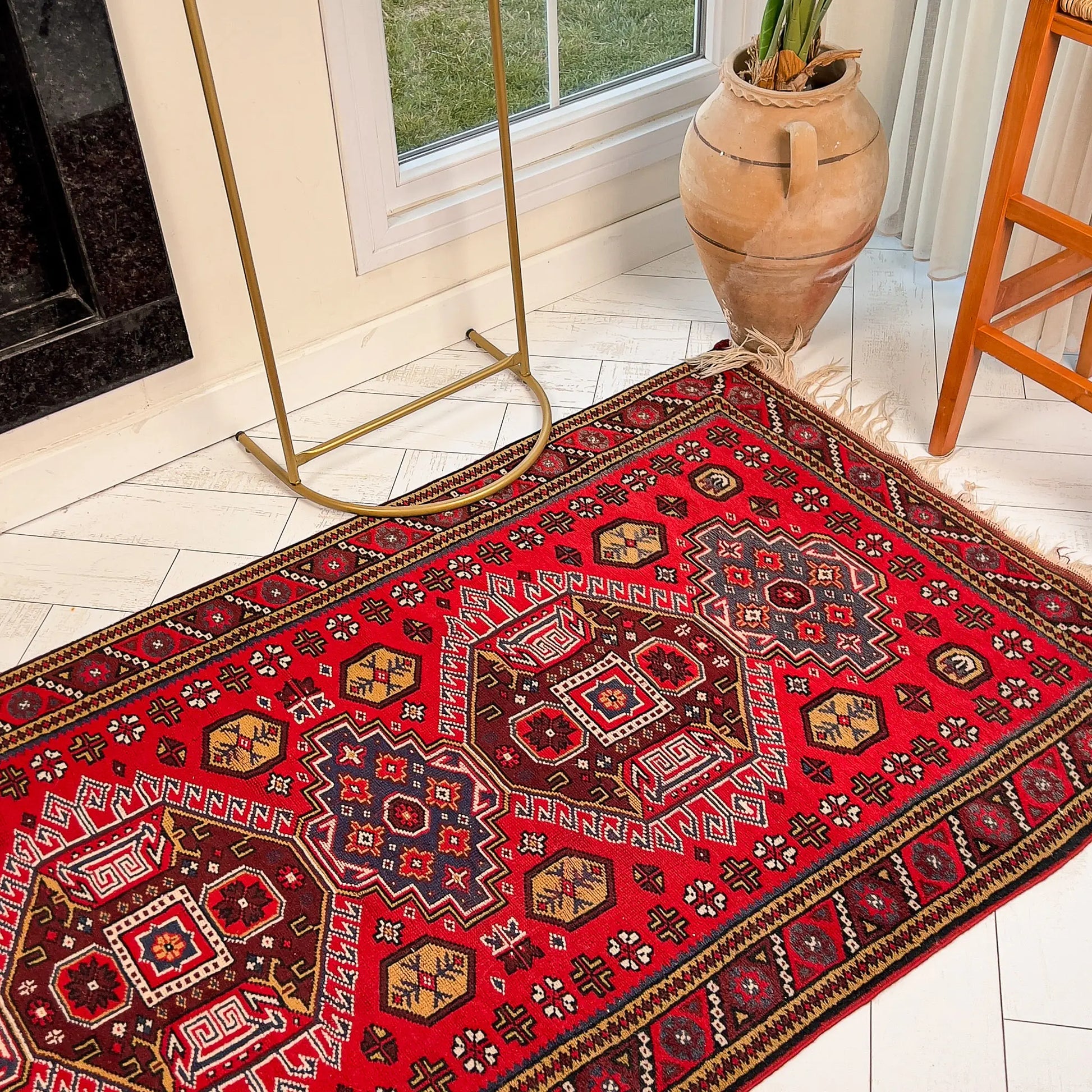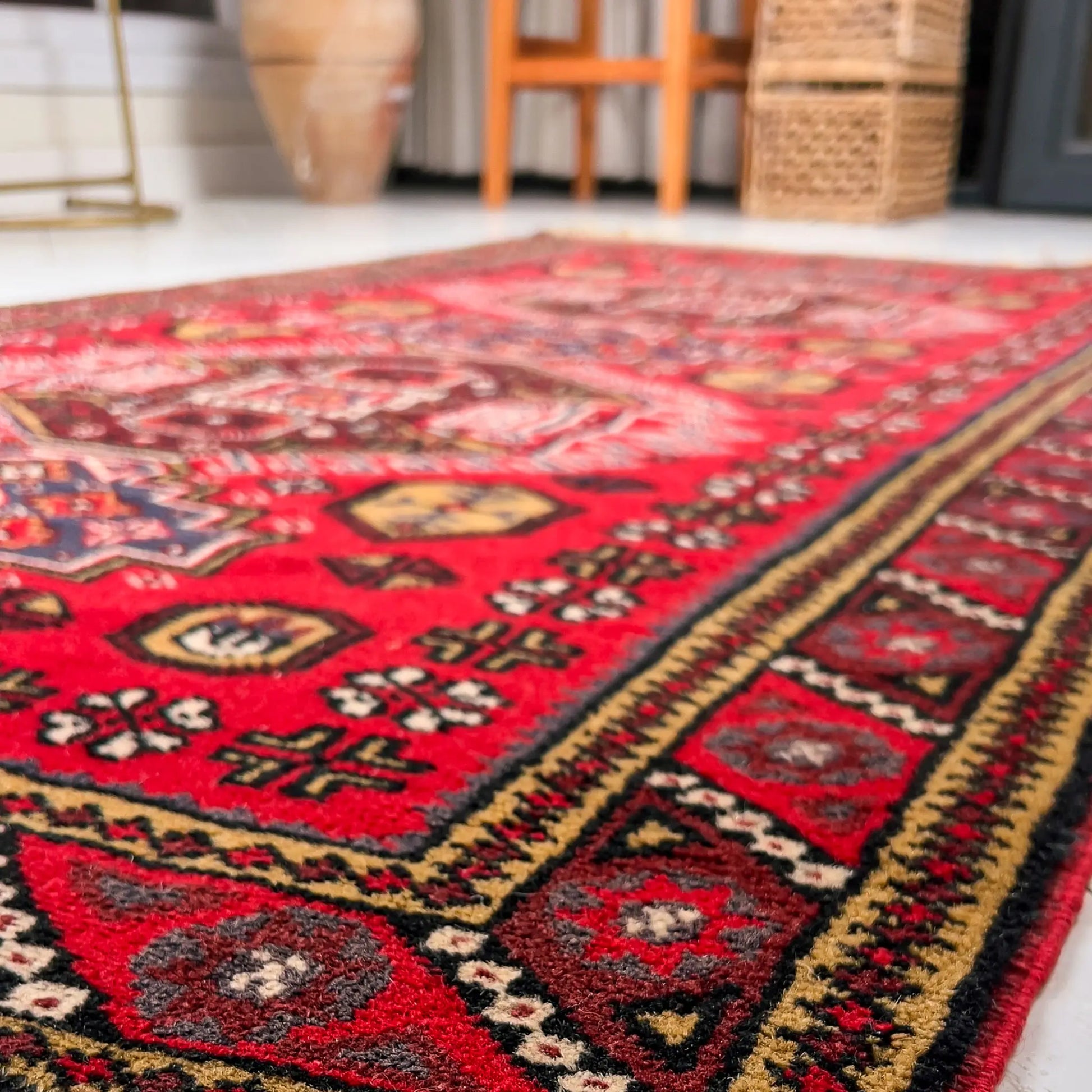 Sık Gördes düğümü, çift atkı yapısı ve yün havı sayesinde tok ve dayanıklıdır; yaklaşık 40 yıllık geçmişiyle seçkin bir vintage halıdır. Kınalı kırmızı, lacivert ve krem dengesi, nötr koltuklar ve sıcak ahşaplarla birleştiğinde odada net, köklü ve dikkat çekici bir odak yaratır.
