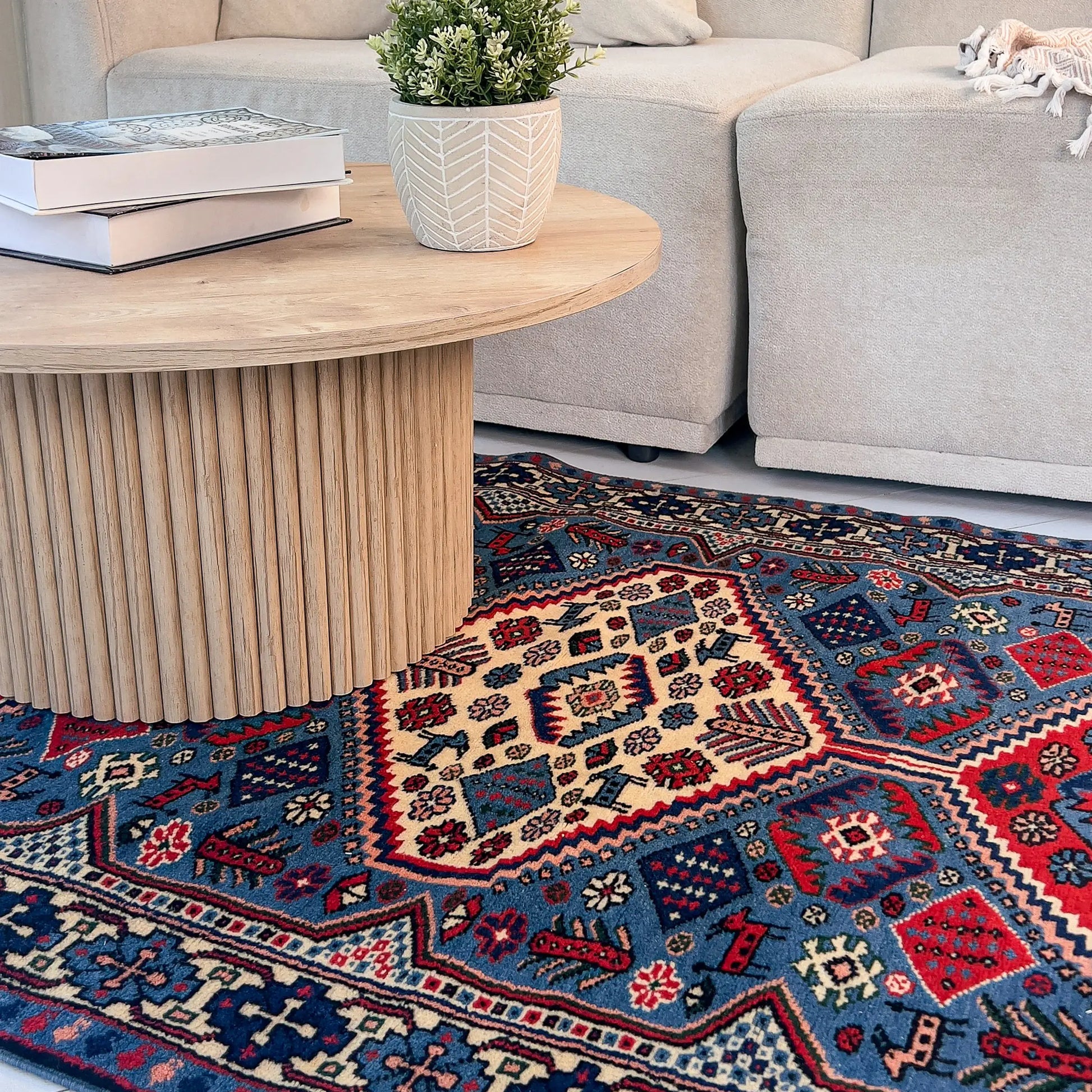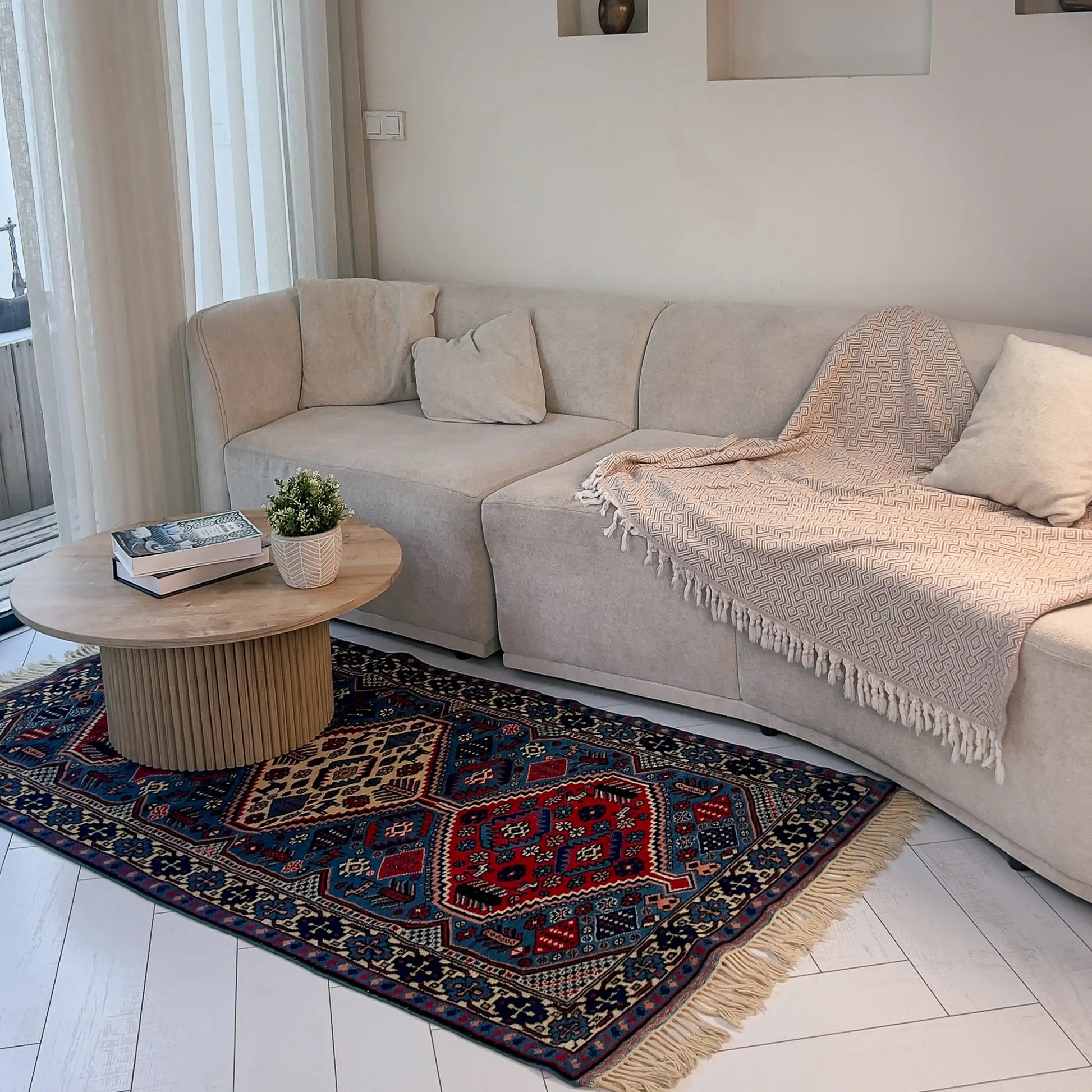 Kırmızı, mavi ve kremin kontrastı; hem cesur hem de dengeli bir atmosfer yaratıyor. Bu halı, bulunduğu mekâna yalnızca renk değil, aynı zamanda Yörüklerin zamansız yolculuk hikâyesini de taşıyor.