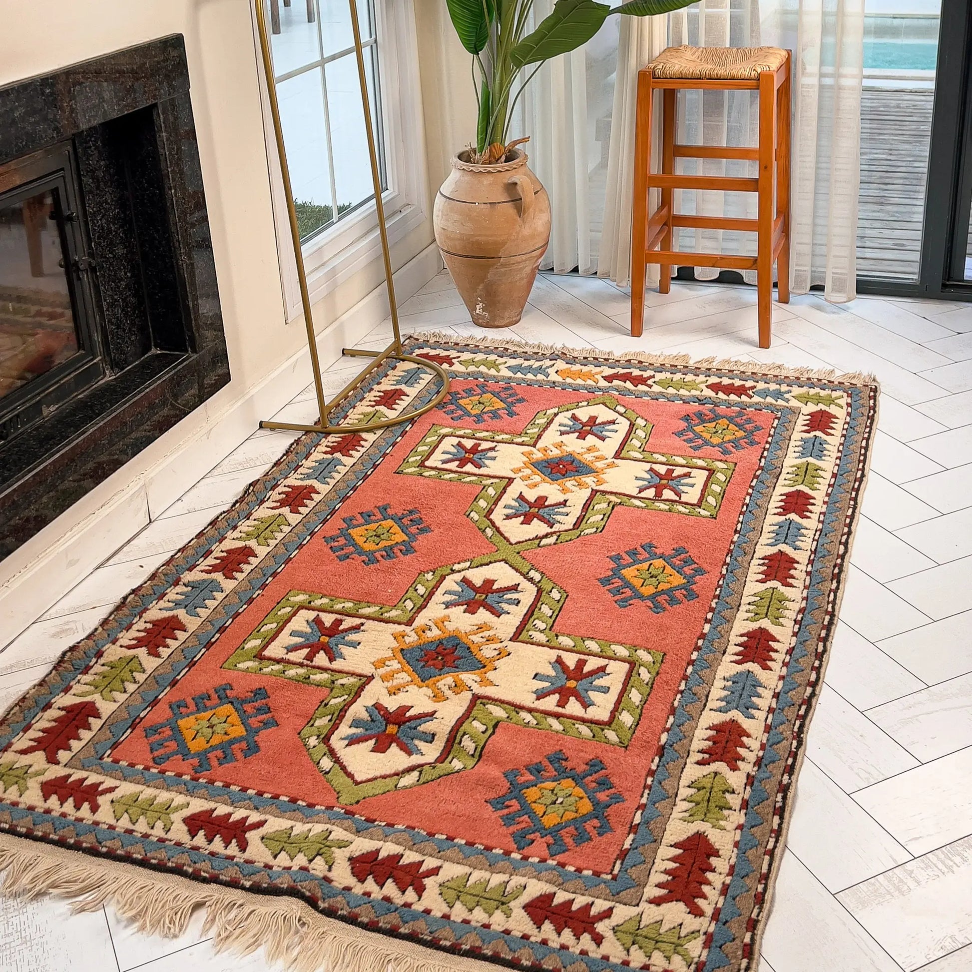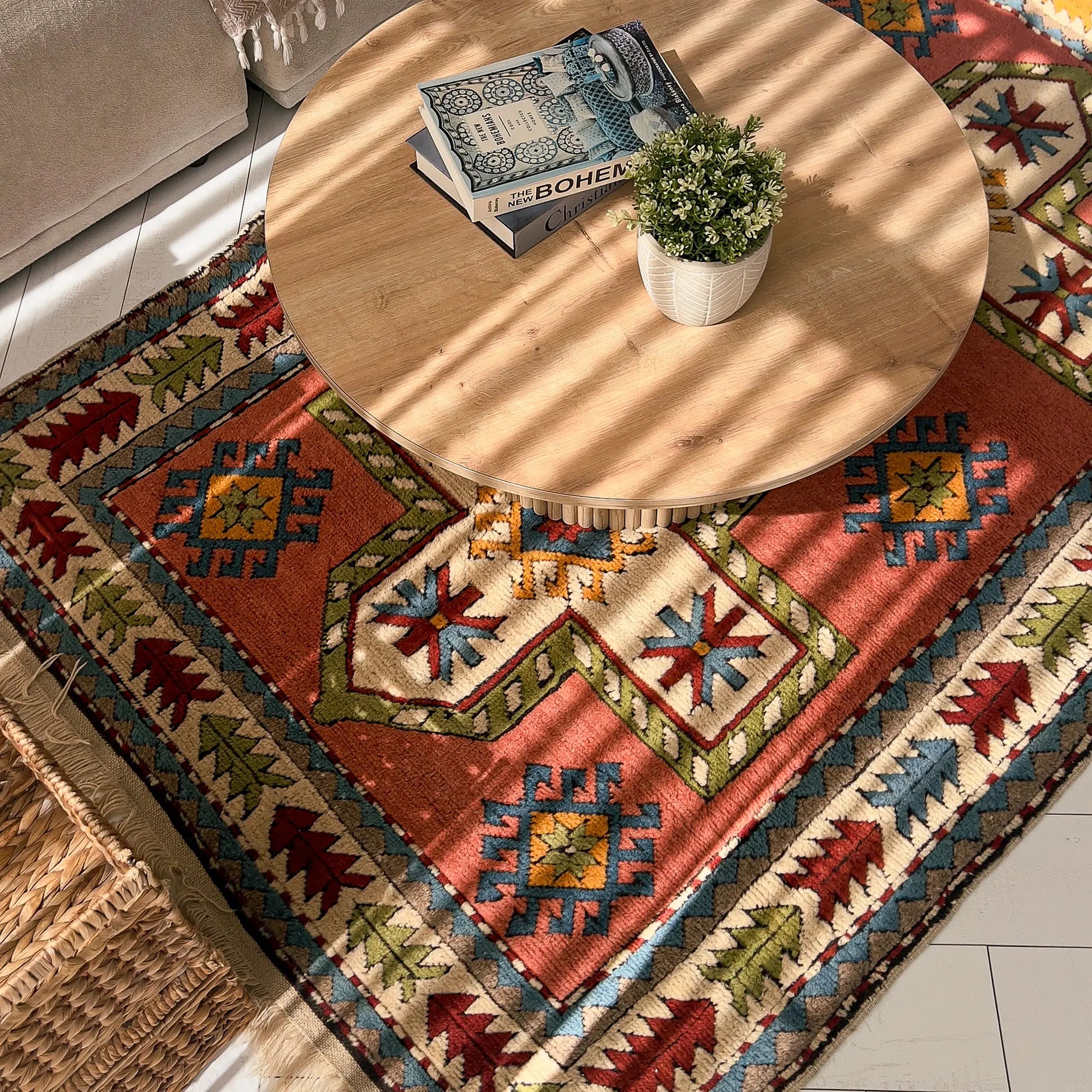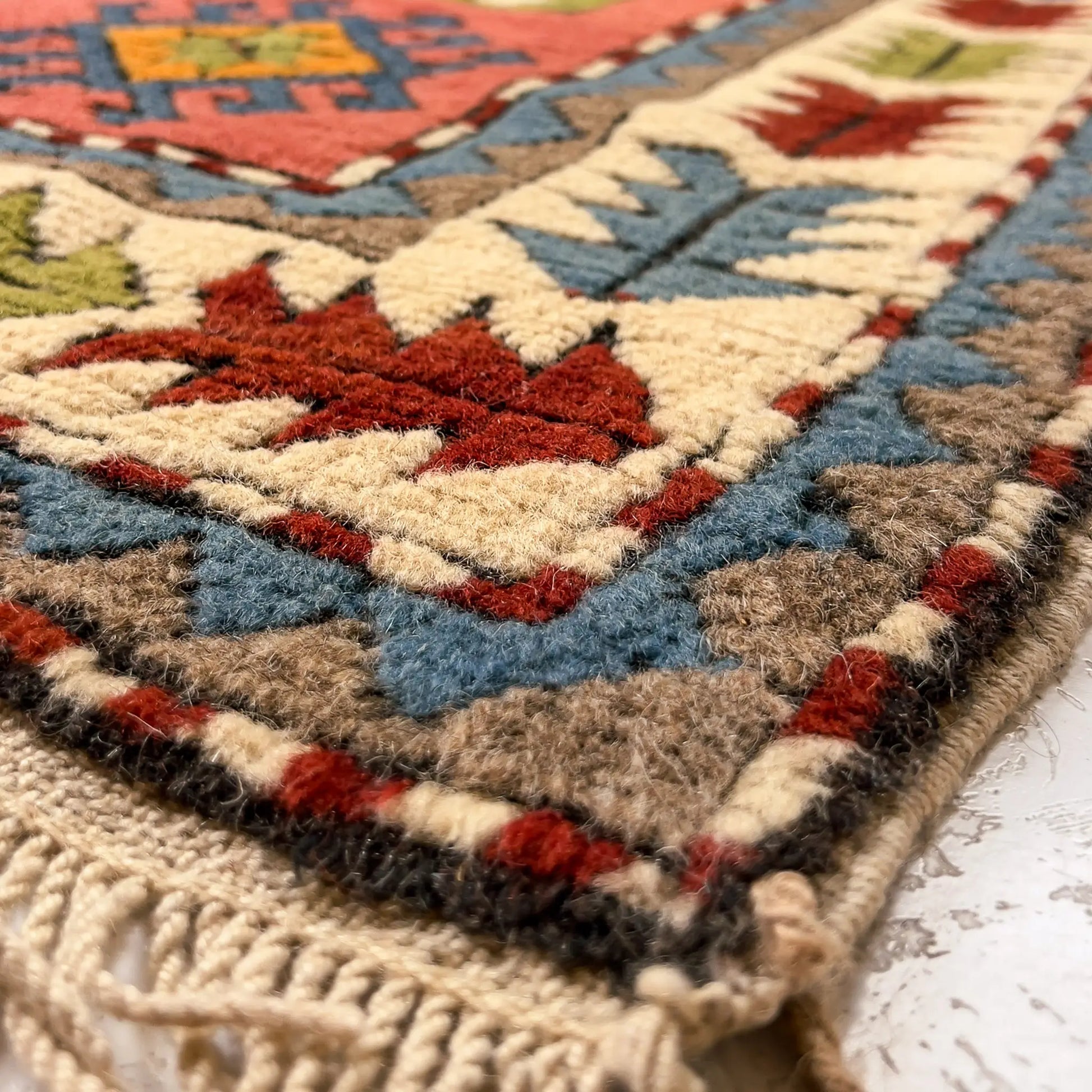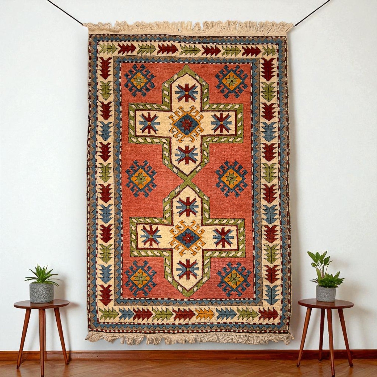 Göçebe üslubun sıcak ve doğal yüzünü yansıtan Yörük halısı, terrakotta zeminde krem medalyonlar, zeytin yeşili kontürler ve mavi dokunuşlarla dengeli bir palet sunar. 200x120 cm ölçüsü, sehpa altı veya okuma köşesi gibi orta boy alanlarda güçlü ama göz yormayan bir odak oluşturur.